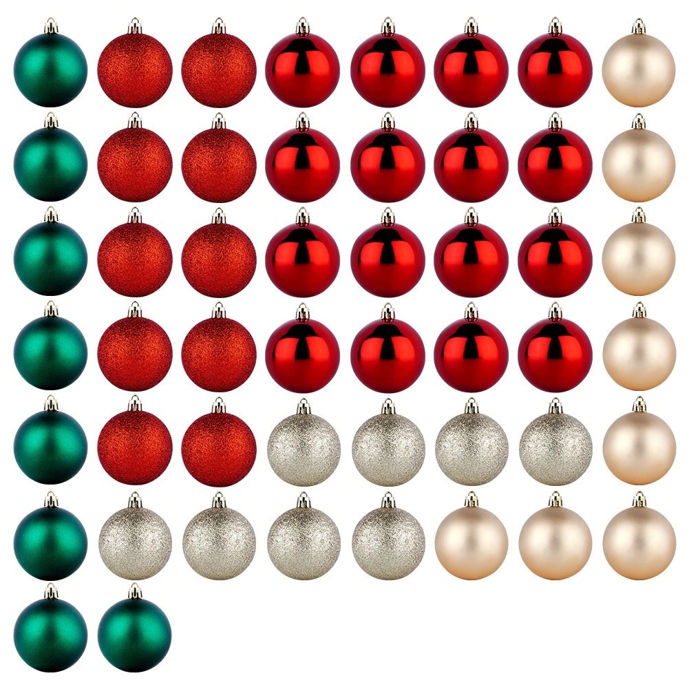 U pakiranju ćete naći pažljivo usklađene kombinacije za lako ukrašavanje: crvene mat i sjajne, šampanj mat i blistave te zelene mat kuglice. Zahvaljujući ujednačenom promjeru 6 cm odlično se kombiniraju i ispunjavaju drvce od vrha do donjih grana.