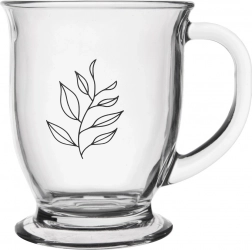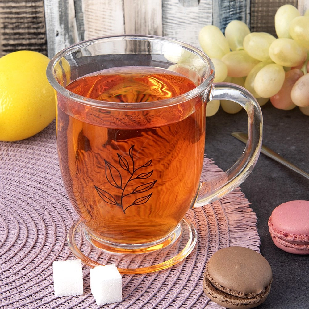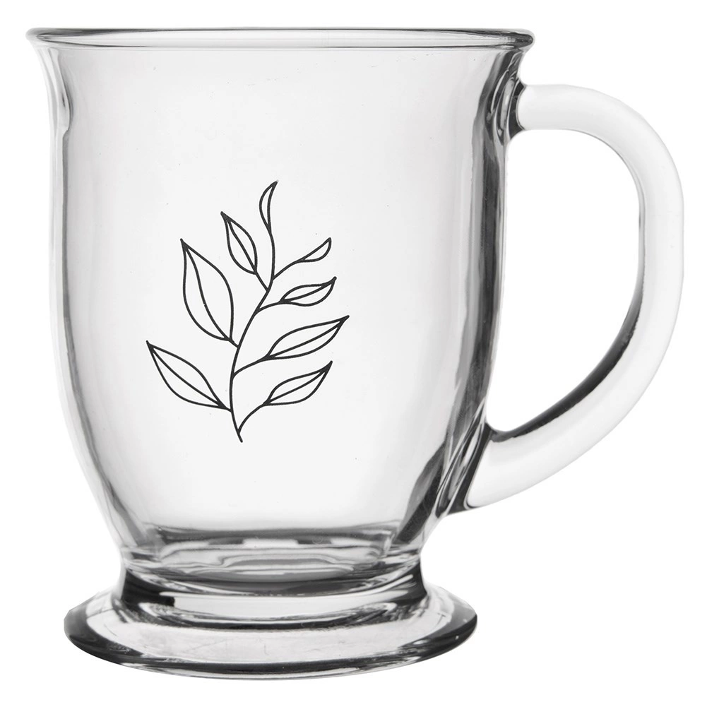 Velika staklena šalica zapremnine 450 ml idealna je za vaše omiljene tople napitke. Zahvaljujući prozirnom, debelom staklu uživat ćete u boji čaja ili kave, dok ergonomska ručka osigurava udobno držanje. Jednostavan klasični dizajn s motivom lista savršeno se uklapa u svaku stolnu postavu.