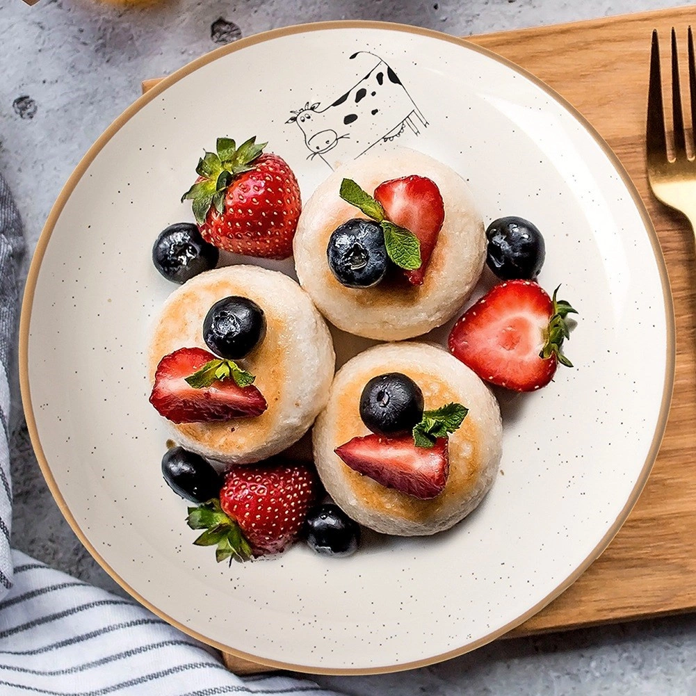 Pretvorite svako posluživanje u mali blagdan. Desertni tanjur promjera 20 cm od kvalitetne keramike u modernoj bež boji s pjegastim uzorkom i prirodnim kamenim obrubom djeluje elegantno i istodobno ugodno. Reljefni motiv kravice daje tanjuru originalan štih i privlači pažnju na prvi pogled.