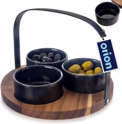 Stilizan set za posluživanje spaja prirodno bagremovo drvo, crnu keramiku i metal u modernoj izvedbi BLACK. Tri posudice sigurno stoje u precizno izfreziranim pozicijama, pa ne kližu pri prenošenju, a središnja metalna ručka omogućuje udobno rukovanje po stolu i prijenos između prostorija.
