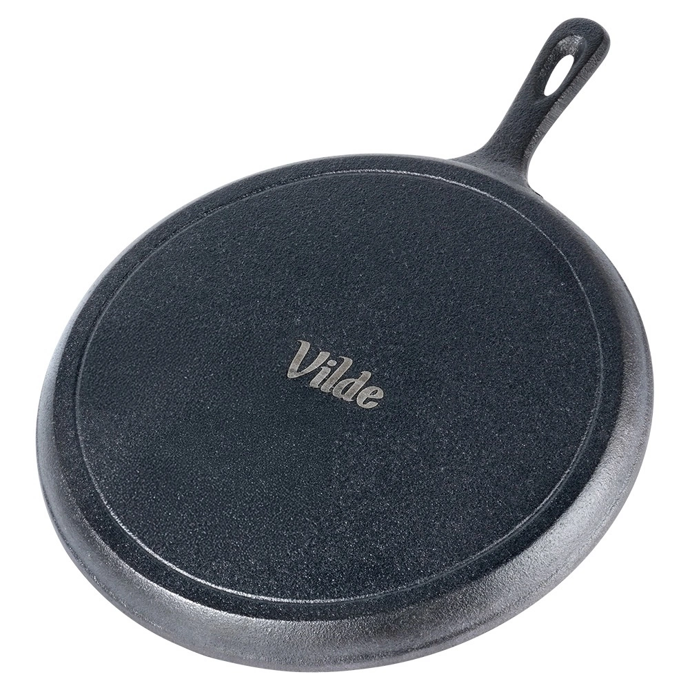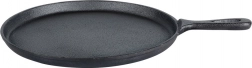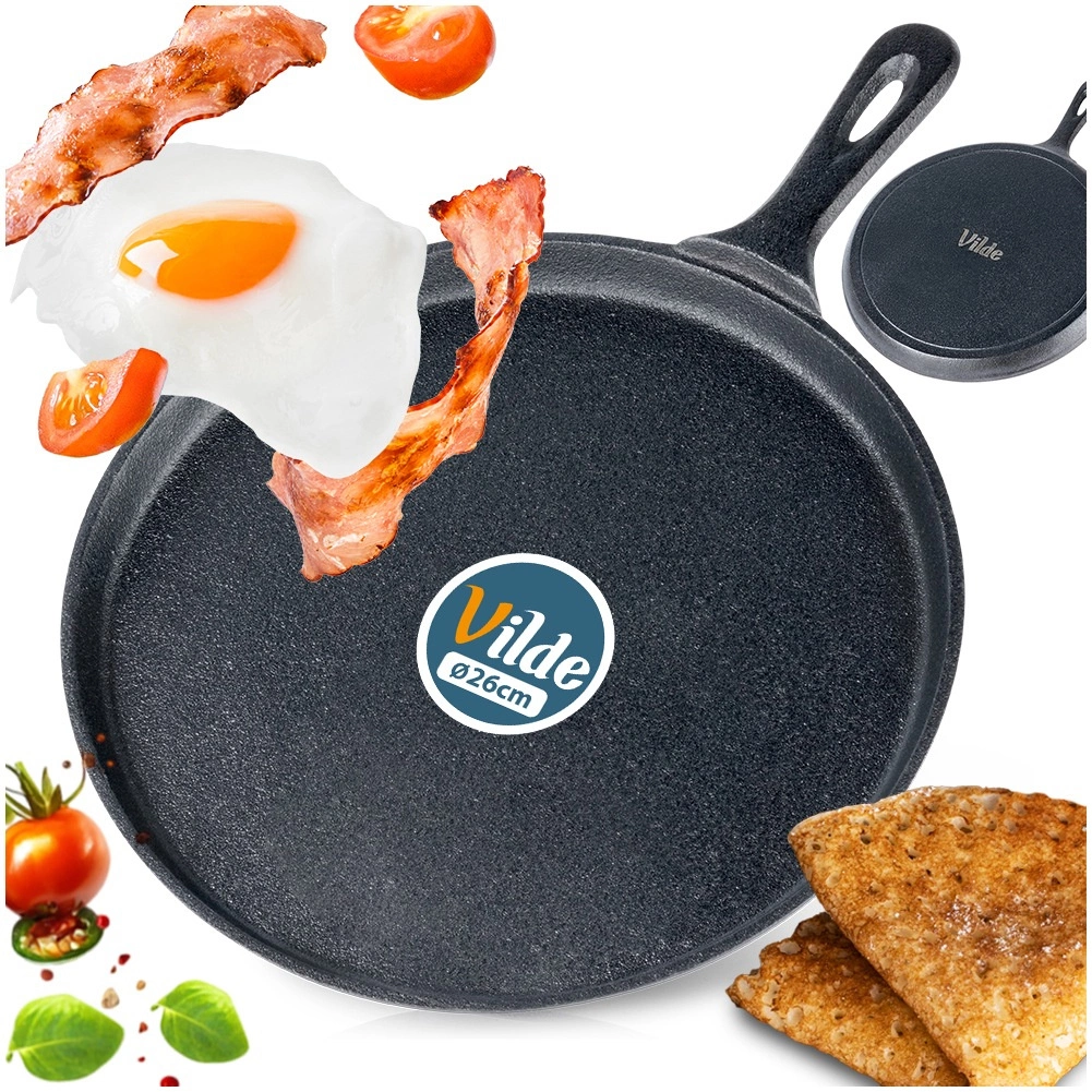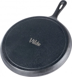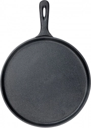 Ova tava od lijevanog željeza promjera 26 cm nudi široku, nisku i potpuno ravnu površinu idealnu za tanke palačinke, tortilje ili pogačice. Lijevano željezo osigurava ravnomjerno pečenje i dugo zadržavanje topline, pa jelo dulje ostaje toplo. Ergonomski oblikovana ručka s otvorom za vješanje olakšava rukovanje i spremanje.