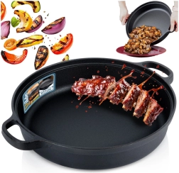 Zahvaljujući univerzalnosti koristit ćete je na plinu, struji, staklokeramici, halogenu i indukciji, kao i u pećnici, na roštilju ili izravno nad vatrom. Praktična dva bočna rukohvata olakšavaju rukovanje pri posluživanju s ploče na stol. Izvrsna za meso, povrće, krumpir, zapečena jela i “one-pot” recepte.