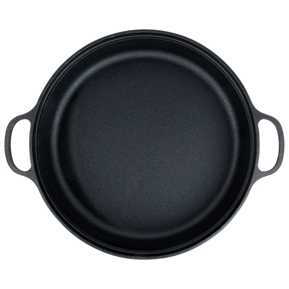 Duboka lijevana tava promjera 30 cm i zapremnine 3,5 l za svestrano kuhanje kod kuće i na otvorenom. Nudi ravnomjernu raspodjelu topline, dugu akumulaciju i prikladna je za štednjak, pećnicu i roštilj. Dva čvrsta bočna drška osiguravaju sigurno prenošenje. Bez neprianjajućih premaza, idealna za prženje, pečenje i pirjanje.