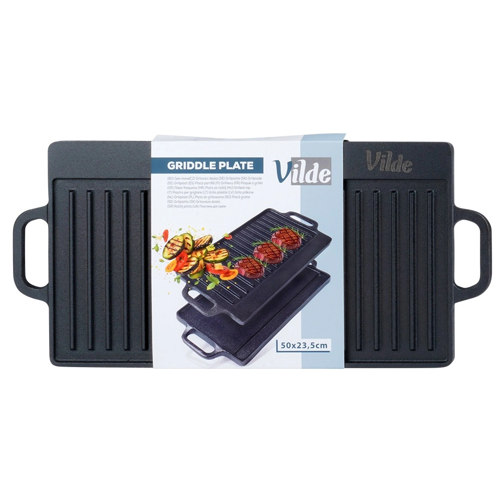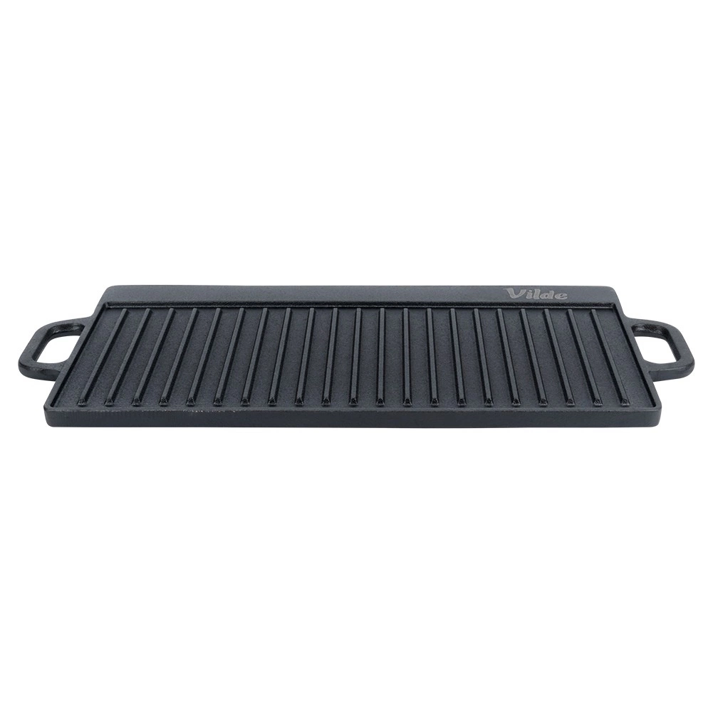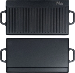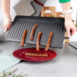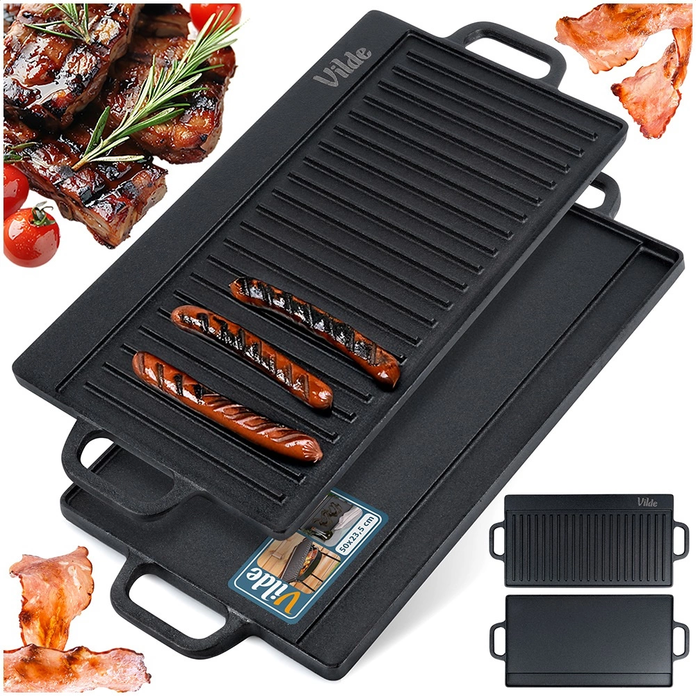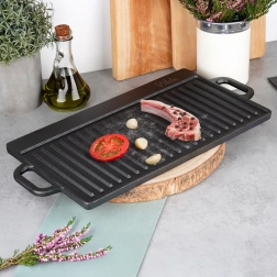 Univerzalna obostrana lijevana ploča za roštilj CAST LINE dimenzija 50,5 × 23,5 cm nudi jednu rebrastu i jednu glatku stranu za savršenu pripremu mesa, ribe, povrća i odrezaka. Masivno lijevano željezo izvrsno provodi toplinu i dugo je zadržava, pa postižete ravnomjerno pečenje i lijepe sear pruge. Prikladna za roštilj, štednjak i pećnicu.