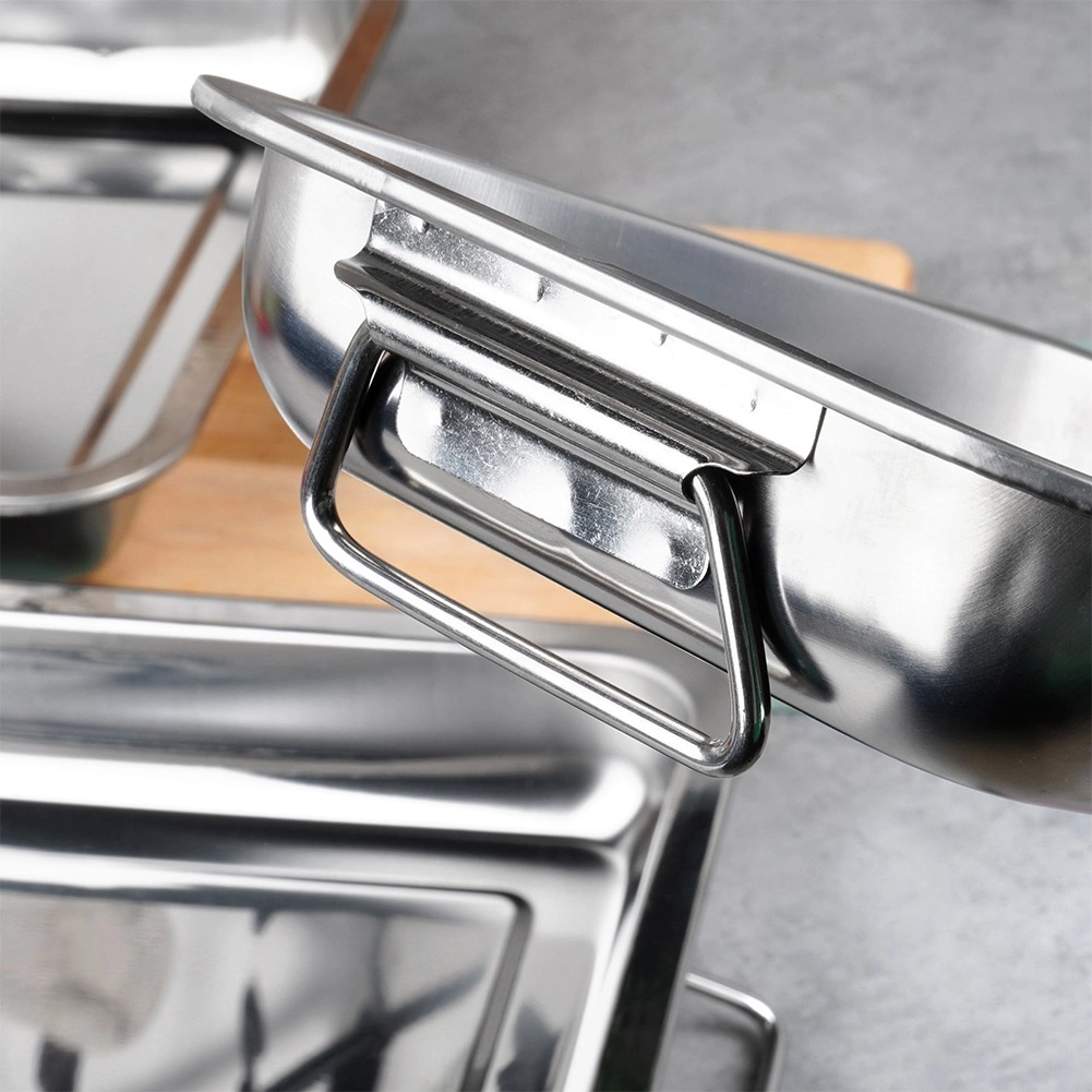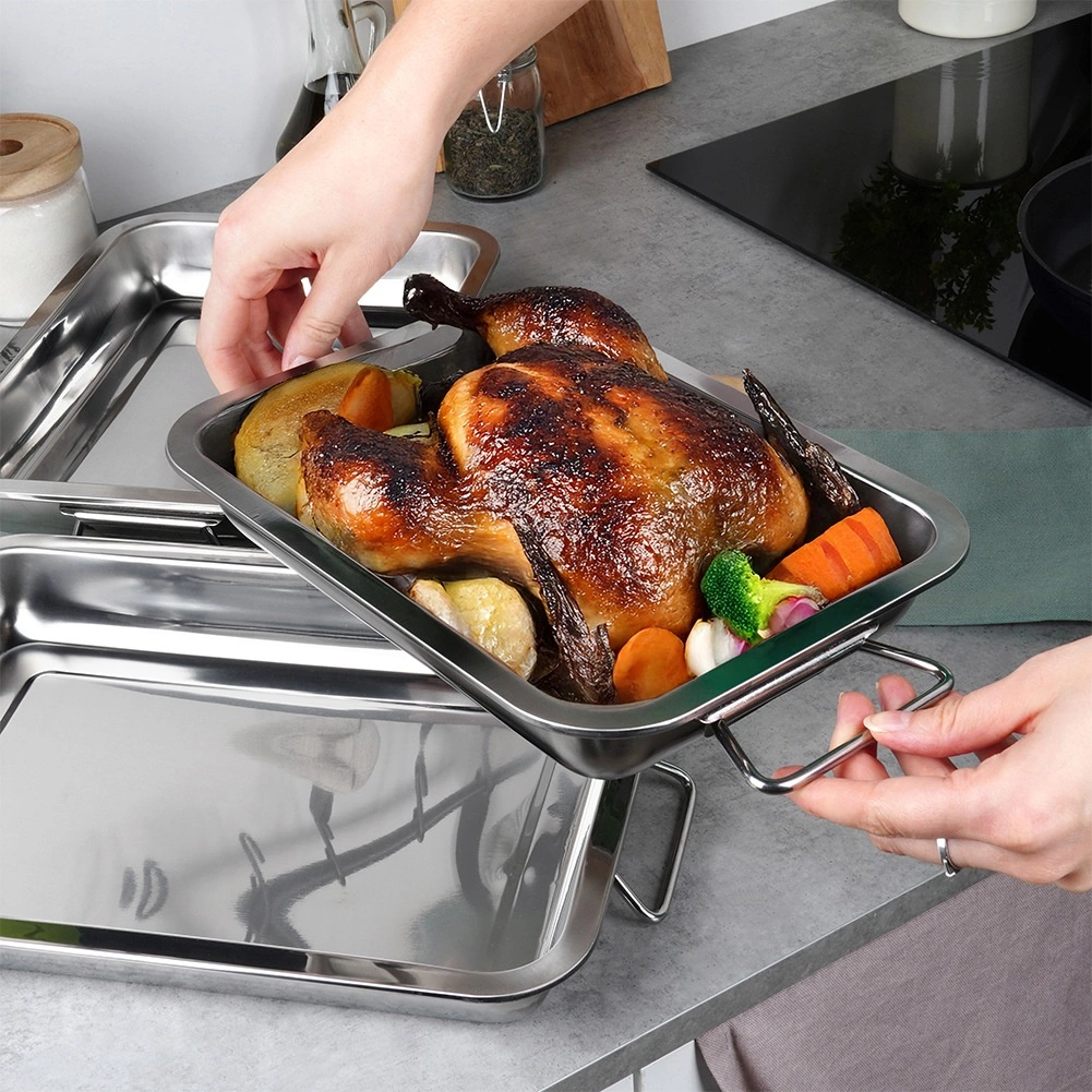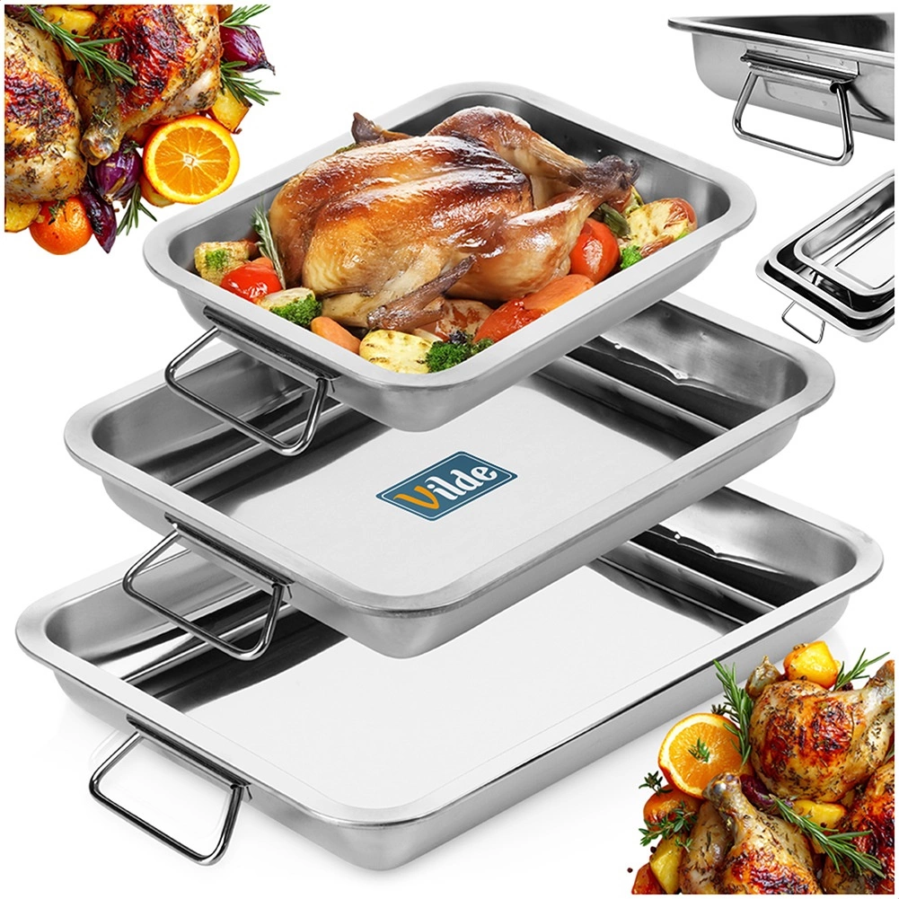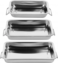 Set triju nehrđajućih pekača u različitim veličinama idealan je za obiteljsko pečenje i gastro okruženja. Debele stijenke i kvalitetni nehrđajući čelik osiguravaju ravnomjernu raspodjelu topline i dugotrajnost. Sklopive bočne ručke omogućuju sigurno prenošenje i ujedno štede prostor pri odlaganju.