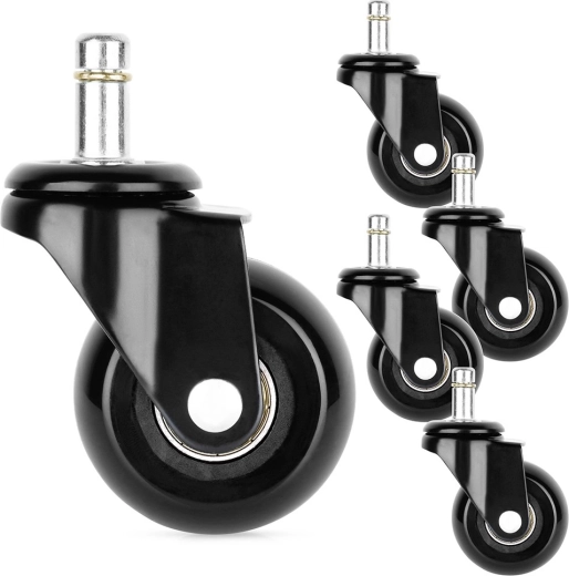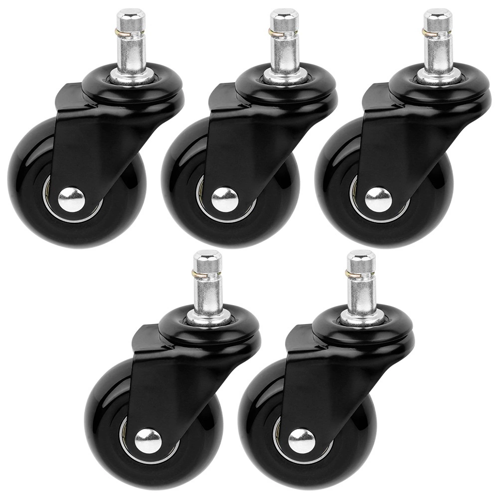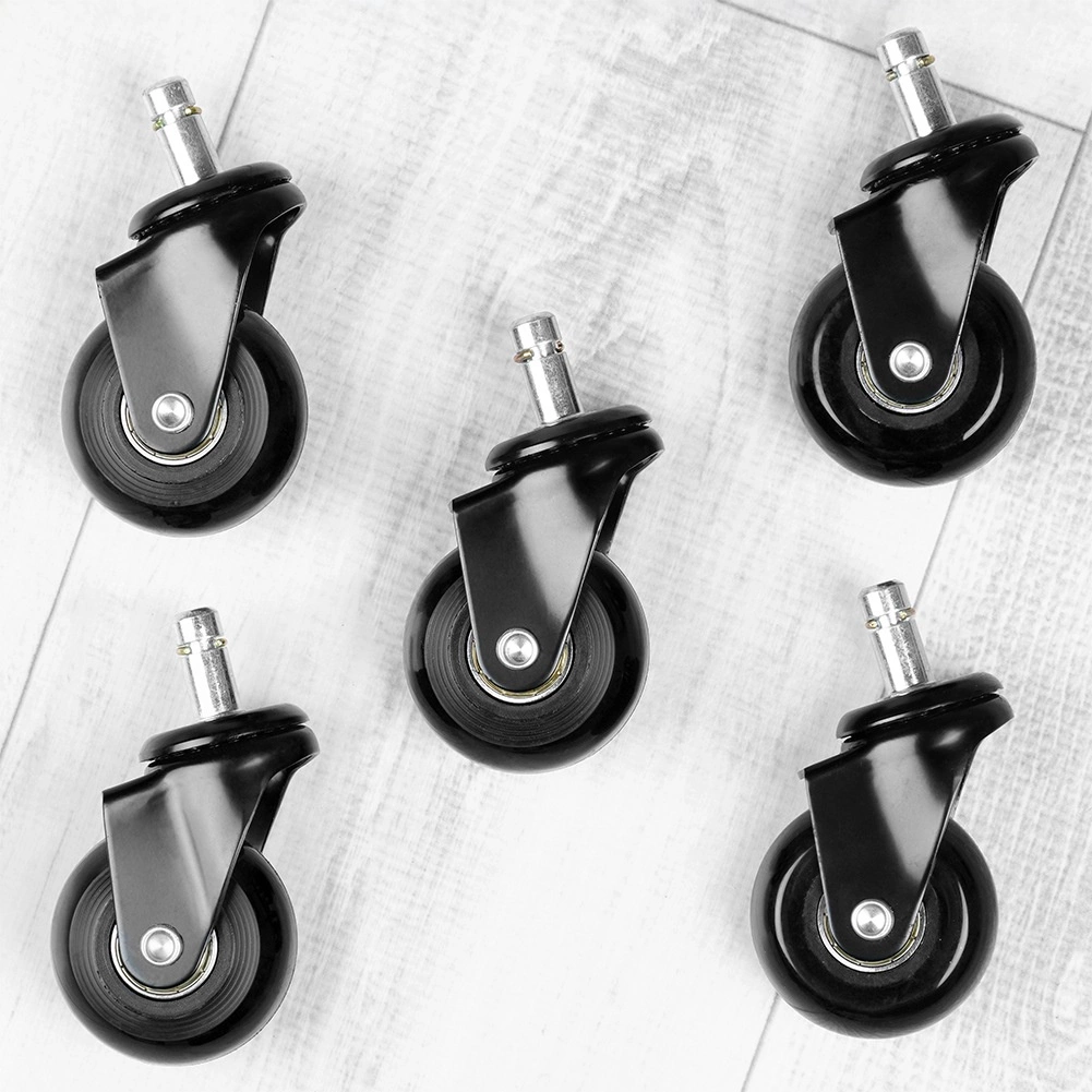 Praktičan set od pet zamjenskih kotačića za uredsku stolicu donosi tih i gladak pomak po tvrdim podovima. Gumena površina minimalizira buku i vibracije te istodobno štiti podove od ogrebotina. Zahvaljujući promjeru kotačića 50 mm i metalnom klinu 10 mm lako odgovaraju širokom rasponu stolica.