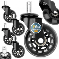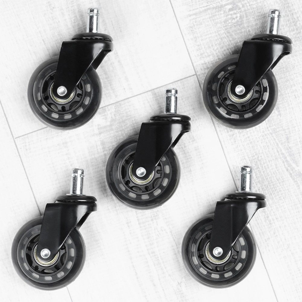 Kaučukna površina pomaže zaštititi pod od ogrebotina i nepotrebnog trošenja, kako u uredu tako i kod kuće. Zamjena je pitanje trenutka – kotače jednostavno umetnete u križ stolice bez potrebe za alatom.