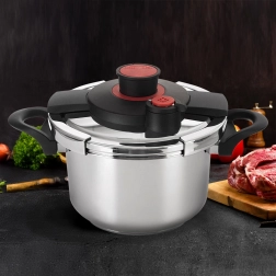 Lonac podržava kuhanje pod tlakom s 2 programa i režimom ispuštanja pare, a ne nedostaje ni sigurnosni ventil za bezbrižnu upotrebu. Kompatibilan je s plinskim, električnim, staklokeramičkim, halogenim i indukcijskim pločama za kuhanje. Tijelo se može prati u perilici posuđa (bez poklopca), a robusne ručke i upravljački elementi od izdržljive plastike osiguravaju udoban hvat.