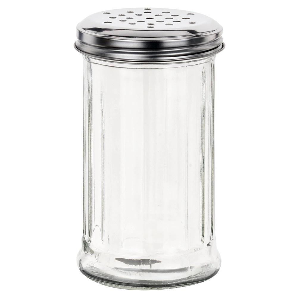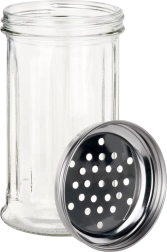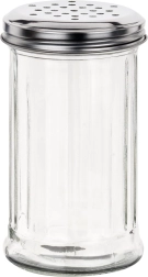 Praktična staklena posudica za začine zapremnine 350 ml s nehrđajućim poklopcem s rupicama za udobno i kontrolirano doziranje. Izrađena od izdržljivog debelostijenog stakla koje je prozirno za laku kontrolu sadržaja. Idealna za sol, papar, bilje ili šećer, pogodna za kućanstvo i ugostiteljstvo te se može prati u perilici posuđa.