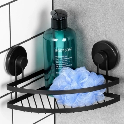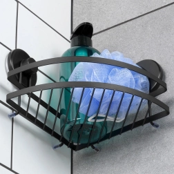 Ova kutna polica za tuš spaja minimalistički dizajn i visoku funkcionalnost. Prašno lakirani metal u mat crnoj izdržljiv je, lako se čisti i odlično se uklapa u moderne i klasične kupaonice. Zahvaljujući dvjema velikim vakuum čašicama sigurno je pričvrstite na glatke površine poput pločica ili stakla – bez bušenja i oštećenja zidova.