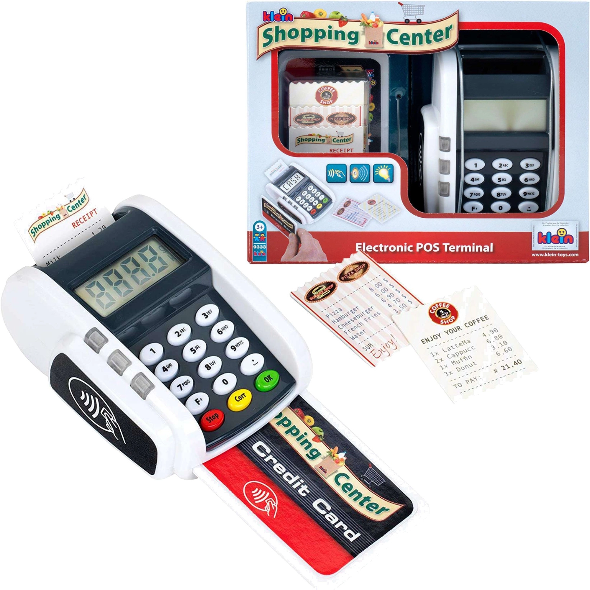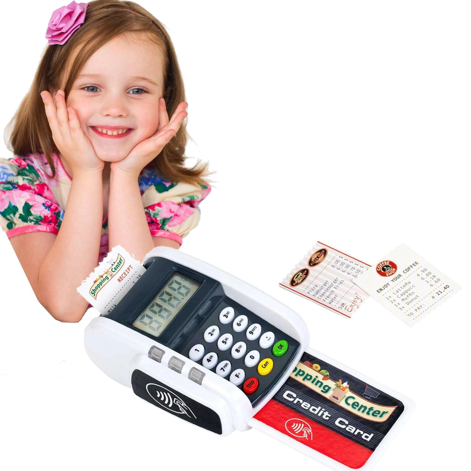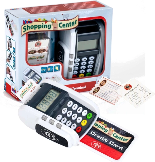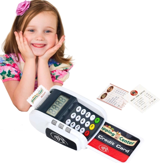 Ovaj kompaktan terminal vjerno oponaša stvaran uređaj: djeca mogu pritiskati numeričku tipkovnicu, prislanjati platnu karticu i „printati račune” za realističnu igru blagajne. Svjetlosni i zvučni efekti svakoj transakciji daju pravi dojam stvarnosti i potpomažu razvoj socijalnih vještina.