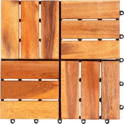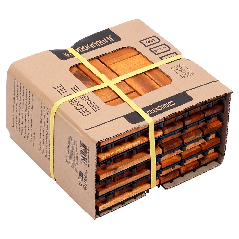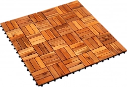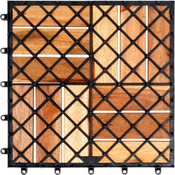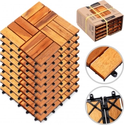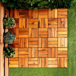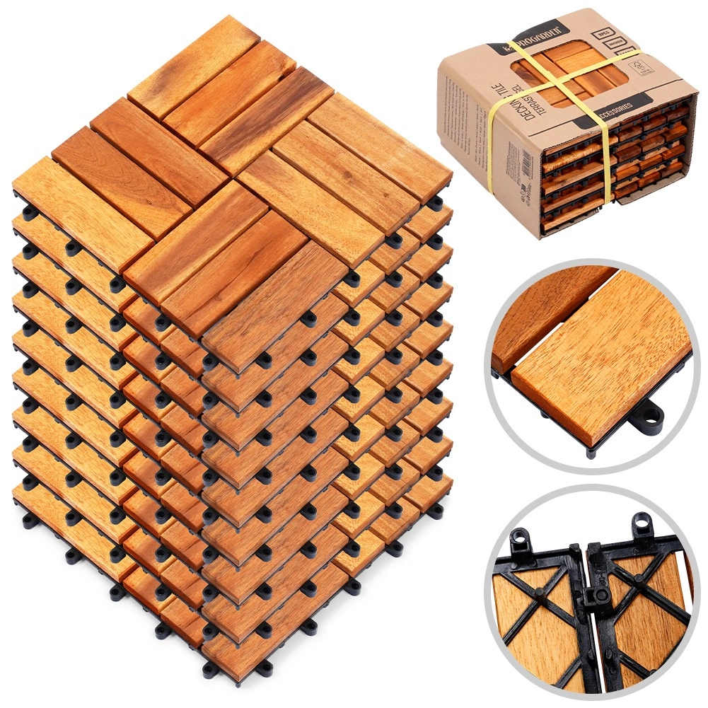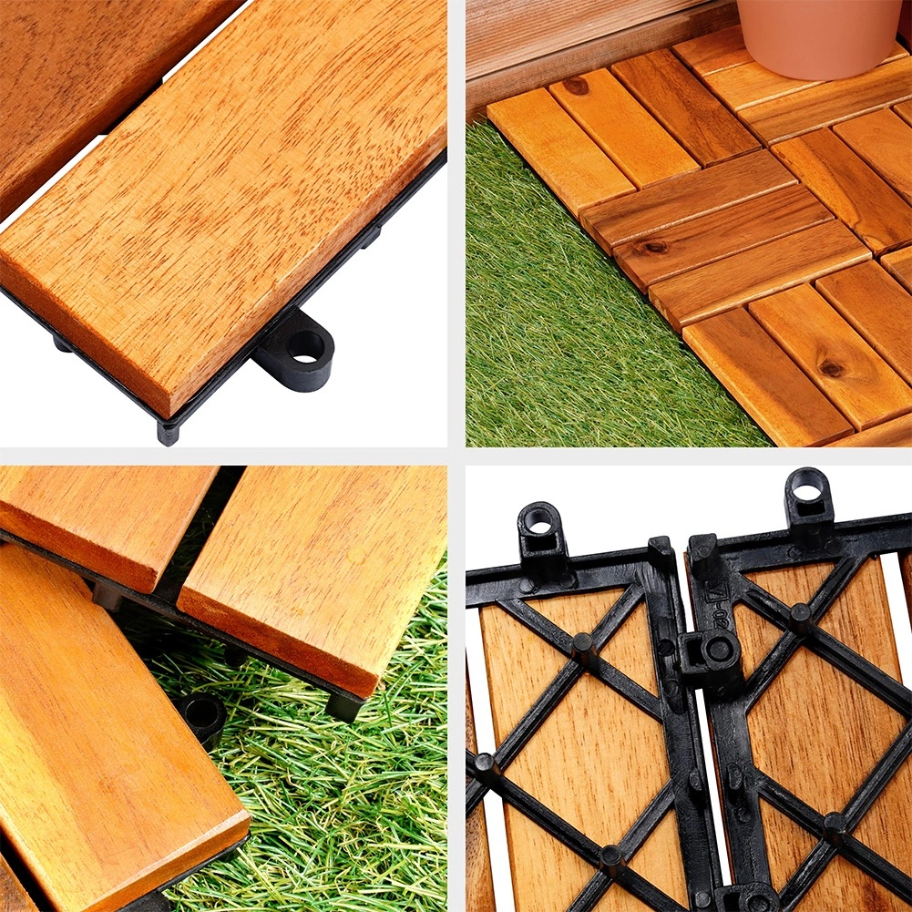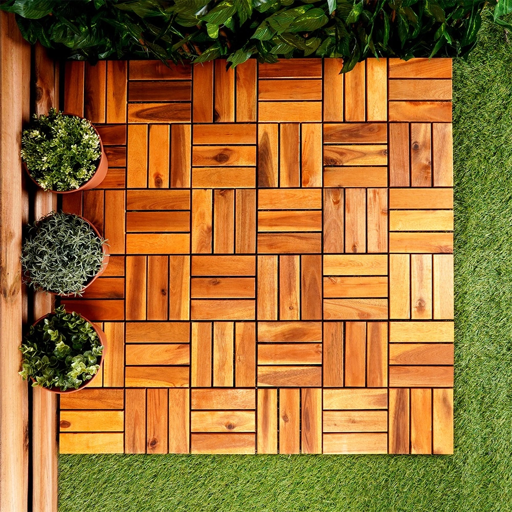 Ove drvene terasne pločice pretvorit će vaš balkon, terasu ili vrtni kutak u ugodnu i stilsku zonu. Površina od kvalitetnog bagremova drva u toploj smeđoj nijansi daje prostoru prirodan izgled, dok se plastična mrežasta baza brine za stabilnost, drenažu i ventilaciju.