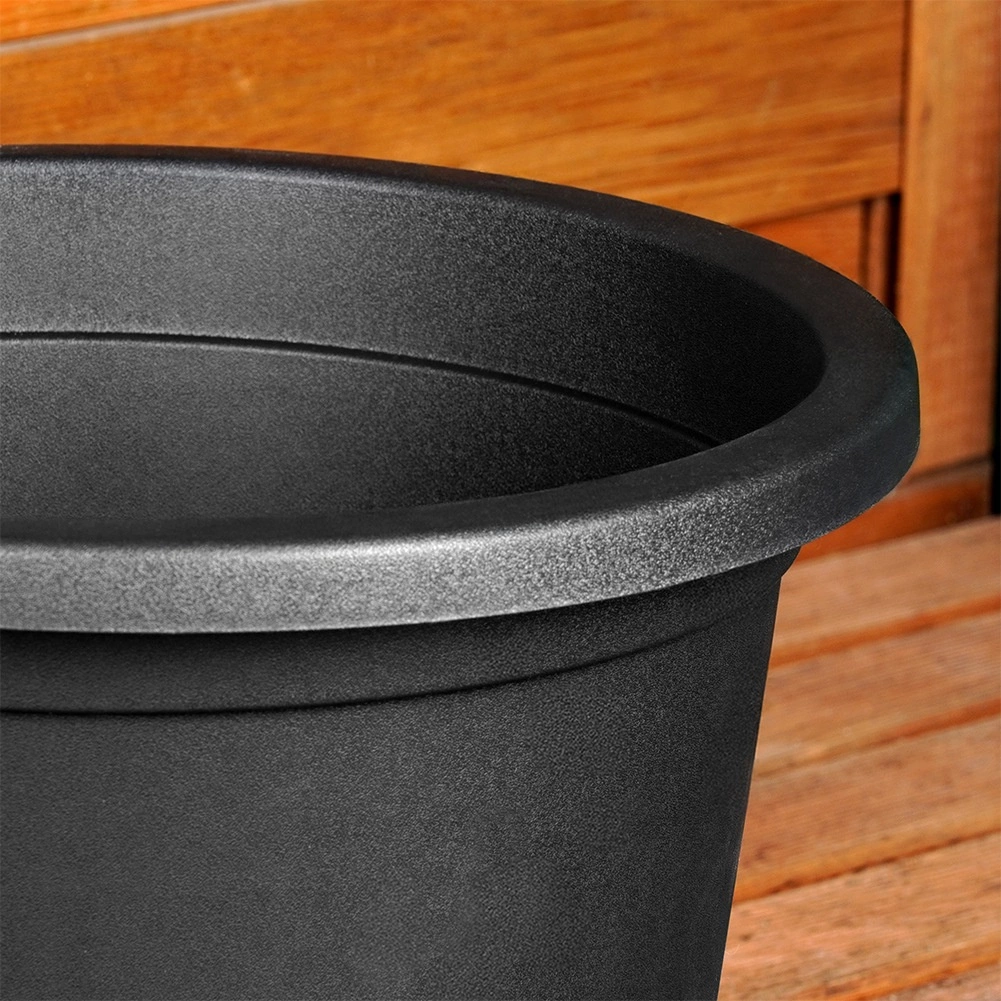 Okrugla plastična posuda 34 cm nudi bezvremenski izgled i praktične dimenzije: gornji promjer 34 cm, donji promjer 24 cm, visina 24 cm. Idealna kao ukrasna posuda ili za izravnu sadnju začinskog bilja, cvijeća i ukrasnih trava. Crna boja naglašava zelene i cvatuće biljke te pristaje svakom stilu vrta.