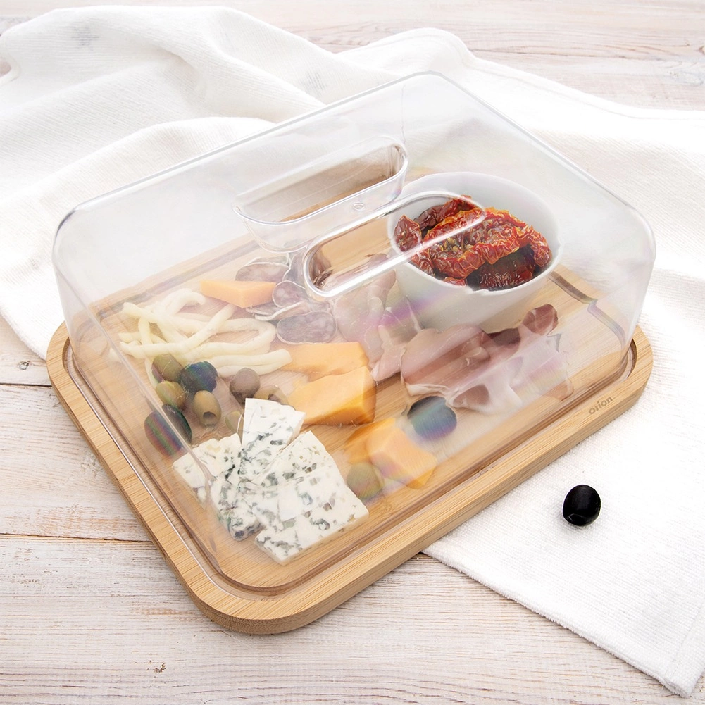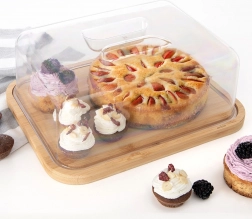 Ova pravokutna bambusova daska s prozirnim poklopcem dizajnirana je za svakodnevno posluživanje i čuvanje namirnica. Dimenzije s poklopcem 28 × 22 × 11 cm pružaju dovoljno prostora za sireve, sendviče, deserte ili voće. Transparentni poklopac s integriranom ručkom omogućuje brz pristup i istodobno održava svježinu poslužene hrane.