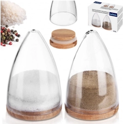 Set sadrži dvije posudice namijenjene za sol i papar. Prozirno tijelo omogućuje trenutni uvid u količinu, dok bukov poklopac sa silikonskom brtvom zadržava aromu unutra i štiti sadržaj od vlage. Zahvaljujući malom dozirnom otvoru na vrhu, nasut ćete točno onoliko koliko trebate – bez nepotrebnog prosipanja.