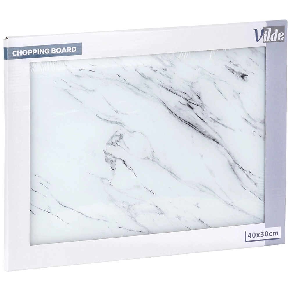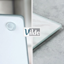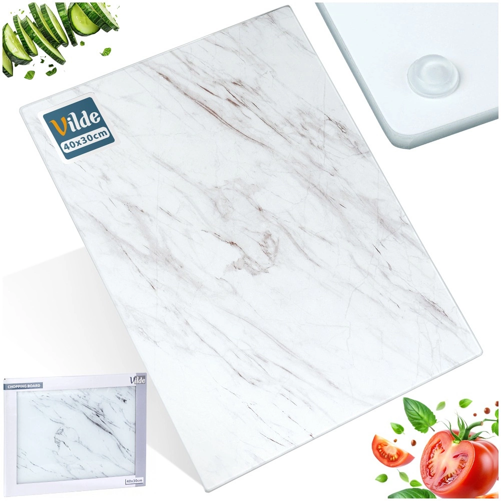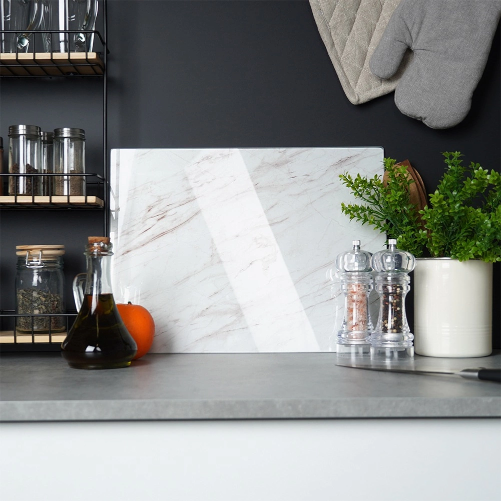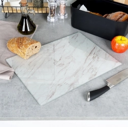 Staklena daska za rezanje s modernim mramornim dekorom odlično će upotpuniti vašu kuhinju. Kaljeno staklo je glatko, neporozno i lako se održava čistim, stoga je idealno za higijinsku pripremu namirnica. Zahvaljujući dimenzijama 40 × 30 cm nudi dovoljno prostora za rezanje peciva, voća, povrća i mesa.