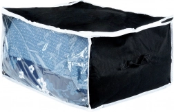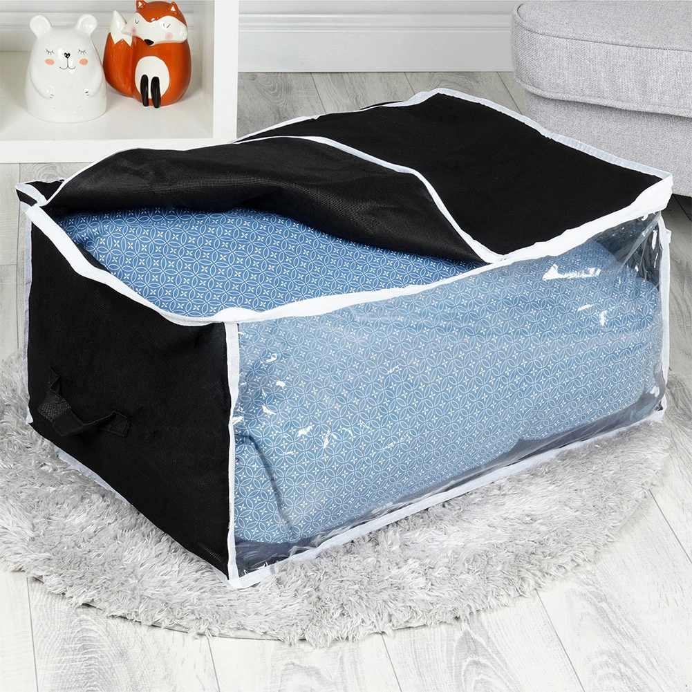 Otkrijte pametno rješenje za kućnu organizaciju. Ova spremna vreća od izdržljive poliesterske tkanine u crnoj boji ima čvrste bočne ručke, prozirni prozorčić za trenutačnu kontrolu sadržaja i dvostruki patentni zatvarač za lako i sigurno zatvaranje. Idealno za sezonske tekstile, posteljinu i glomazniju odjeću.