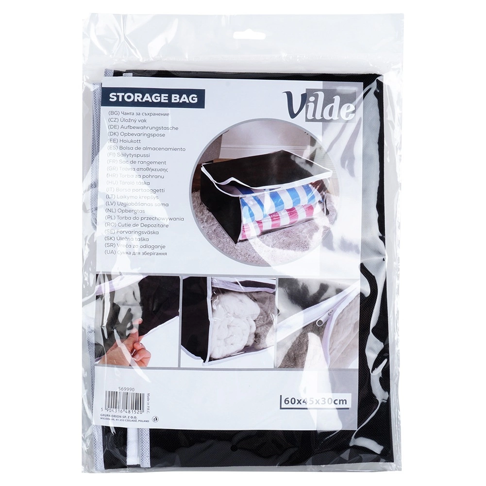 Vreća zapremnine 87 litara i dimenzija 65 × 45 × 30 cm učinkovito štedi prostor u ormaru i ispod kreveta. Materijal pomaže zaštititi spremljene stvari od vlage, prašine i štetnika. Jednostavno rukovanje s viših polica i teško dostupnih mjesta.