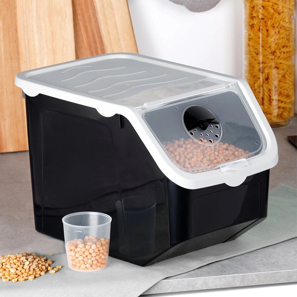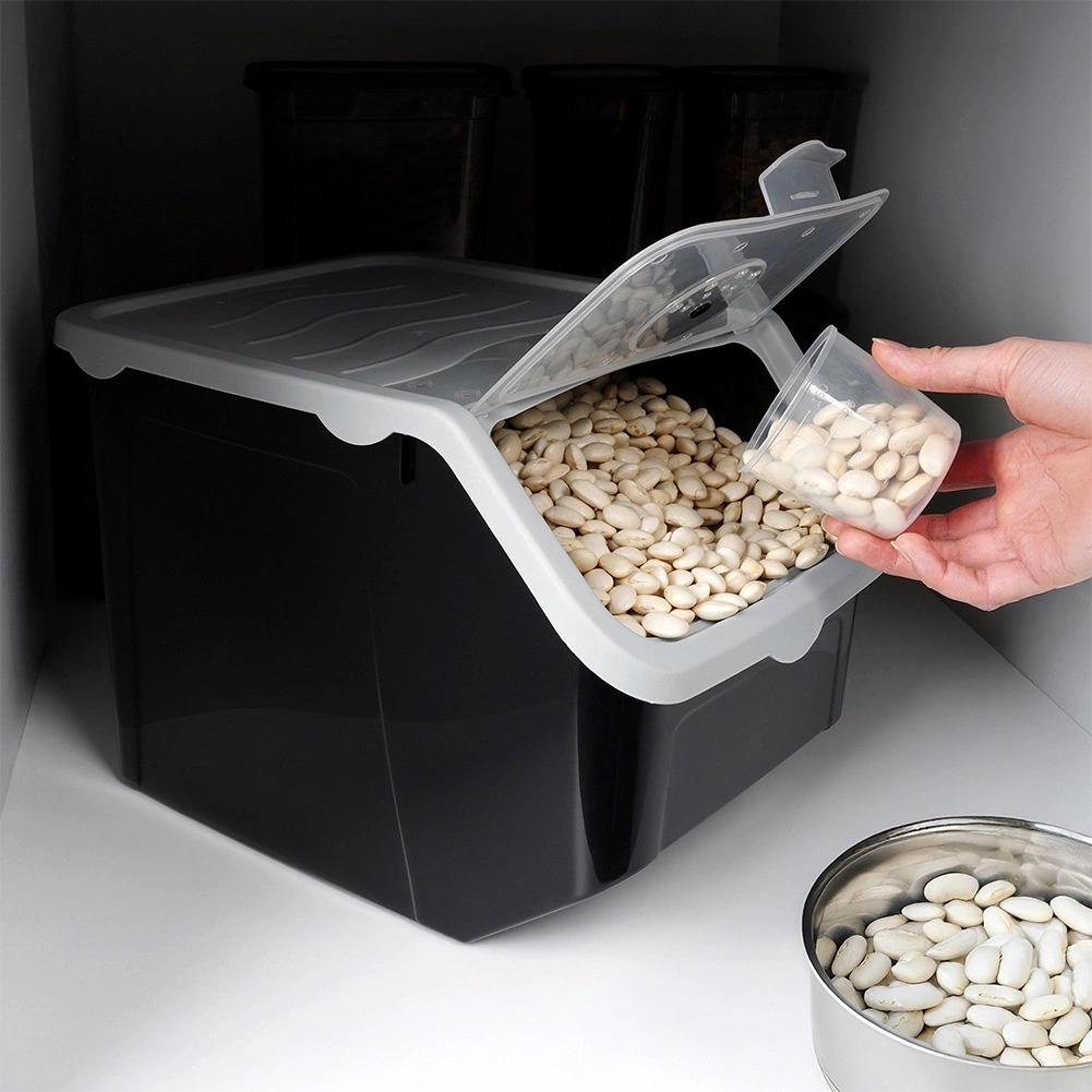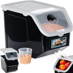 Kutija je od kvalitetne plastike u crnoj boji sa sivim poklopcem, pogodna za kontakt s hranom, podnosi temperature od -20 °C do 100 °C, možete je staviti u zamrzivač i perilicu posuđa. Odlično služi i za mahunarke, rižu, tjesteninu, hranu za ljubimce ili deterdžente u prahu. Dio pakiranja je praktična mjerica za precizno doziranje.