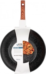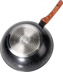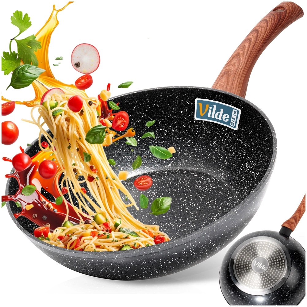 Otkrijte praktični granitni wok u elegantnoj kombinaciji crne i drvenog izgleda iz kolekcije VILDE Black&Wood. Duboko, zaobljeno tijelo omogućuje udobno sotiranje, miješanje i bacanje namirnica iznad plamena, dok neljepljiva granitna površina osigurava lako odvajanje jela i brz završni uredan rad.