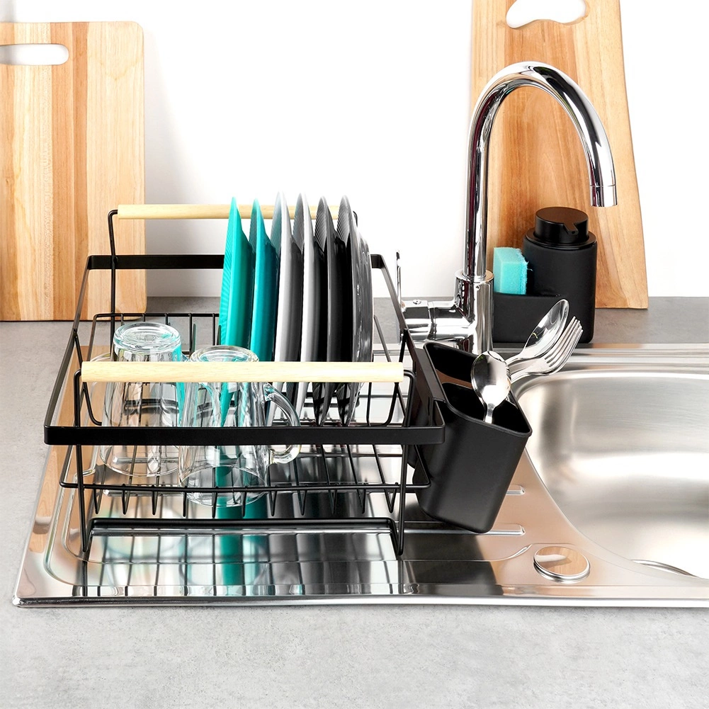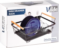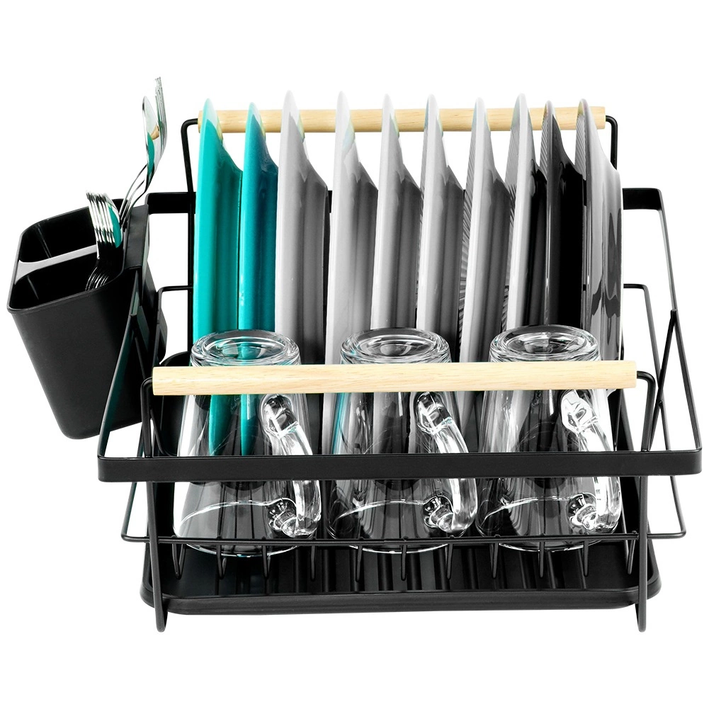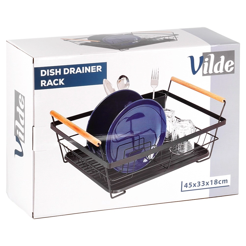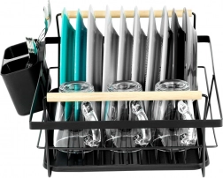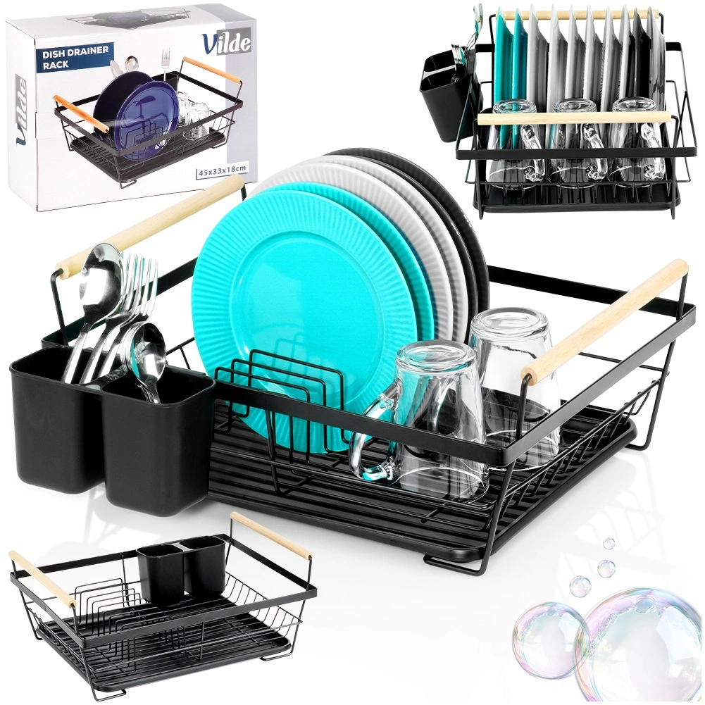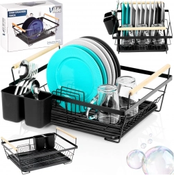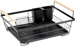 Elegantni crni ocjeđivač posuđa kombinira čvrstu metalnu konstrukciju s praktičnom organizacijom za tanjure, čaše i pribor. Izvlačna ocjeđujuća posuda pouzdano zadržava vodu i održava kuhinjsku radnu plohu bez mokrih mrlja. Dvije drvene ručke omogućuju lako prenošenje, dok se bezvremenski dizajn uklapa u moderne i klasične kuhinje.
