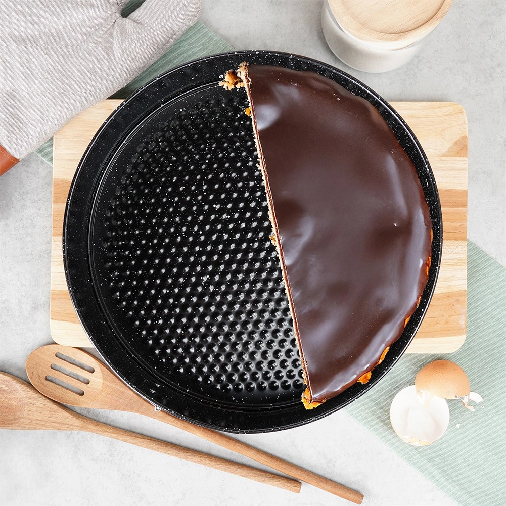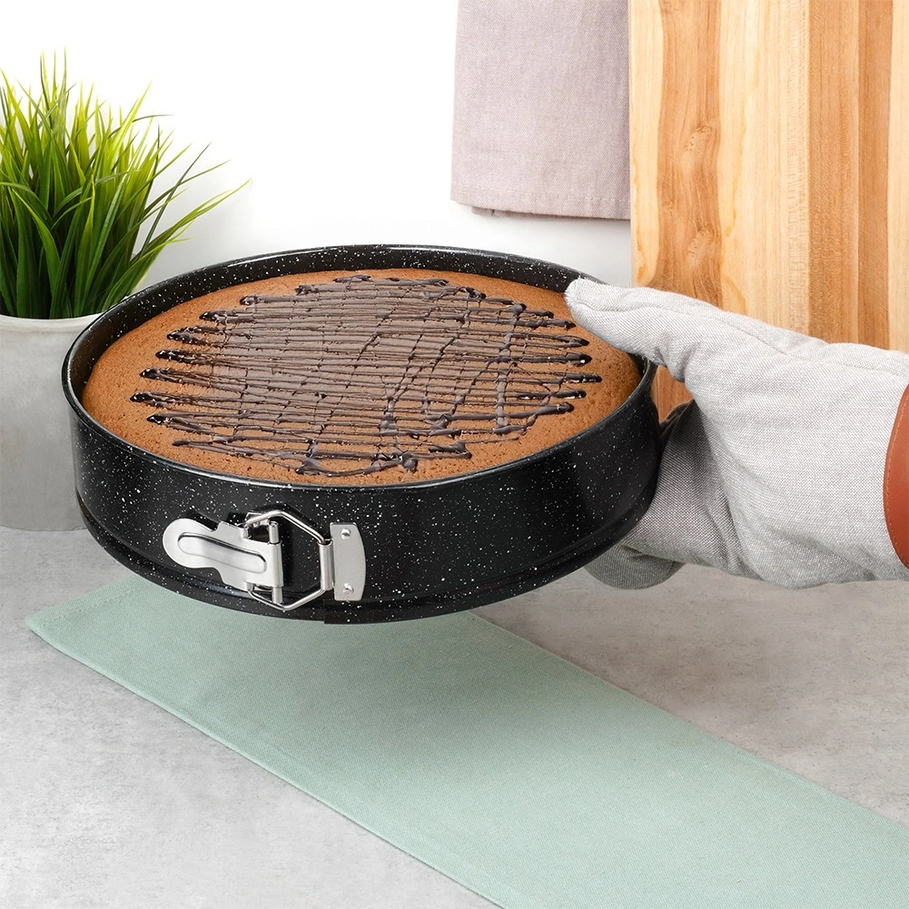 Ovaj kvalitetni granitni kalup za torte od ugljičnog čelika dizajniran je za svakodnevno pečenje s profesionalnim rezultatima. Neljepljivi granitni premaz smanjuje potrebu za masnoćom i sprječava prianjanje, dok čvrste stijenke s rasklopivim zatvaračem omogućuju nesmetano oslobađanje torte bez narušavanja oblika.