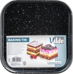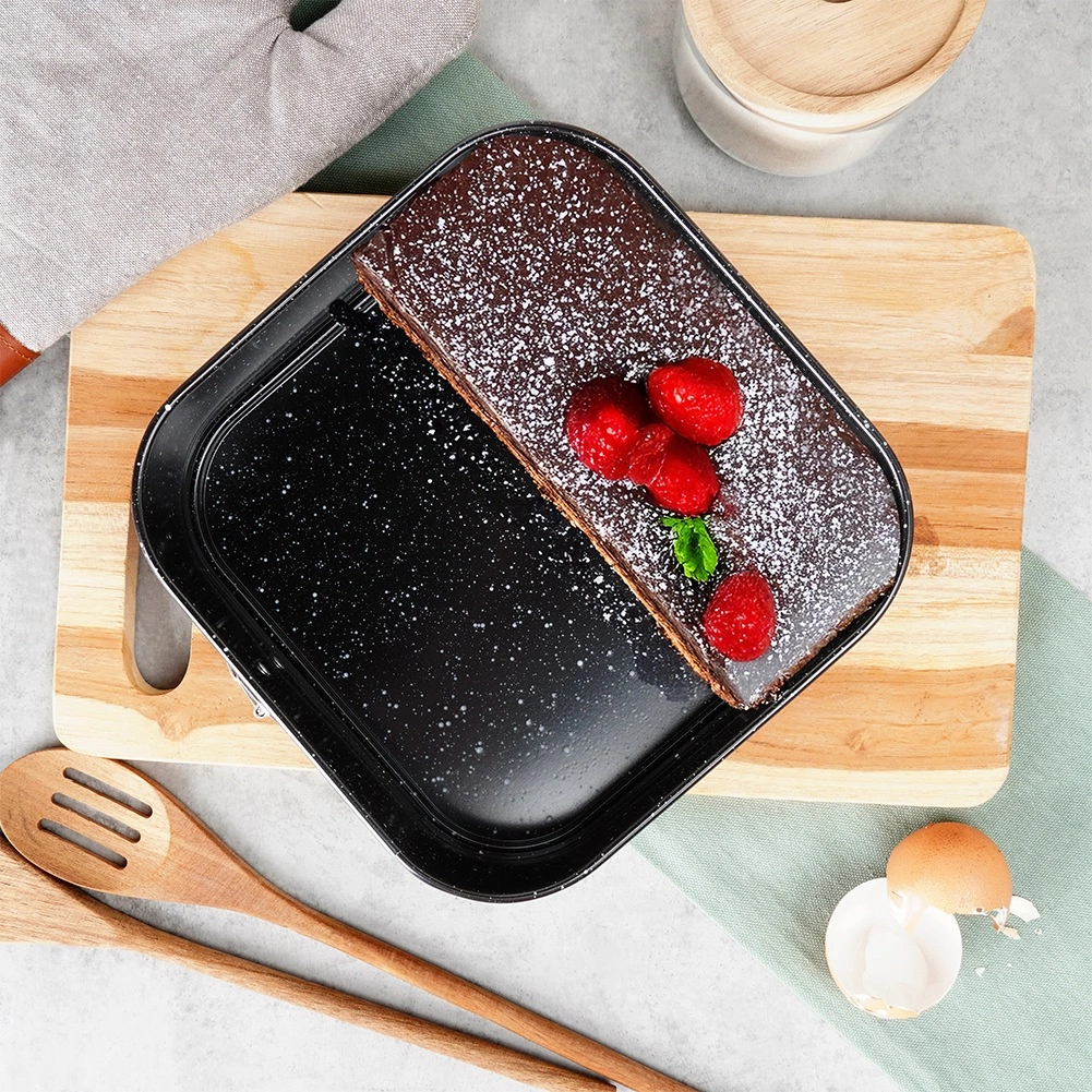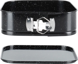 Kvadratni kalup dimenzija 20 × 20 × 6,8 cm izvrsna je opcija za svakodnevno pečenje. Robusni ugljični čelik osigurava stabilnost i ravnomjernu raspodjelu topline, a granitna površina smanjuje prianjanje čak i pri upotrebi male količine masnoće. Zahvaljujući rasklopivom obruču i uklonjivom dnu gotov desert izvadit ćete bez narušavanja oblika.