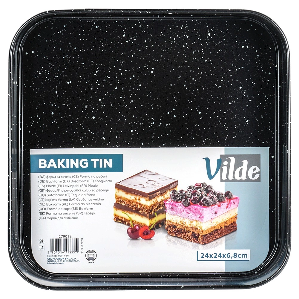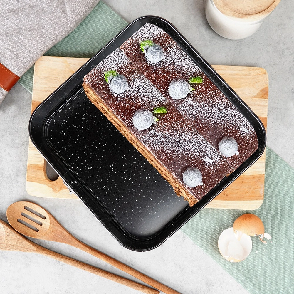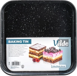 Masivni ugljični čelik osigurava ujednačenu distribuciju topline, otporan je na visoke temperature (do 230 °C) i ne upija mirise ni tekućine. Kalup je prikladan za plinske i električne pećnice, a zahvaljujući kvadratnom obliku odlično služi za pite, kolače u kockama, cheesecake, biskvitne podloge te slana zapečena jela.