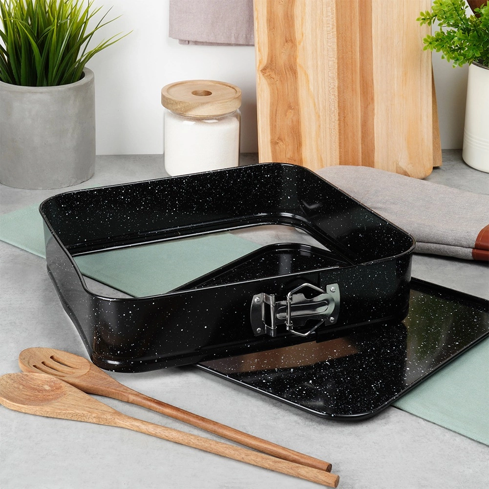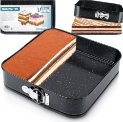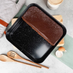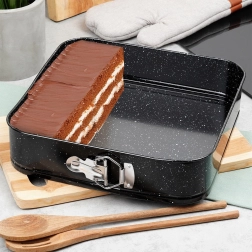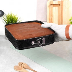 Ovaj kvadratni rastezljivi kalup 28 × 28 × 6,8 cm izvrstan je izbor za svakodnevno pečenje. Tijelo od kvalitetnog karbonskog čelika s granitnim premazom osigurava odlično provođenje topline i smanjuje zagorijevanje. Kalup lako otvorite bočnom kopčom, a zahvaljujući izvlačivom dnu izvadite pečeni korpus bez oštećenja oblika.
