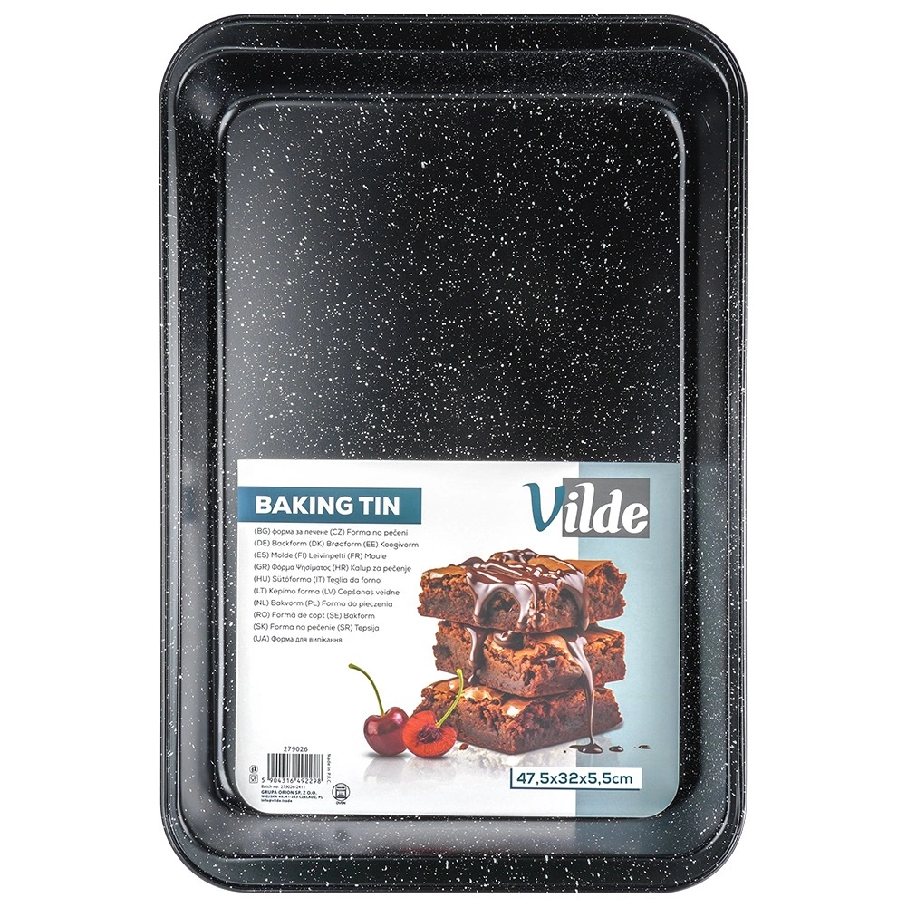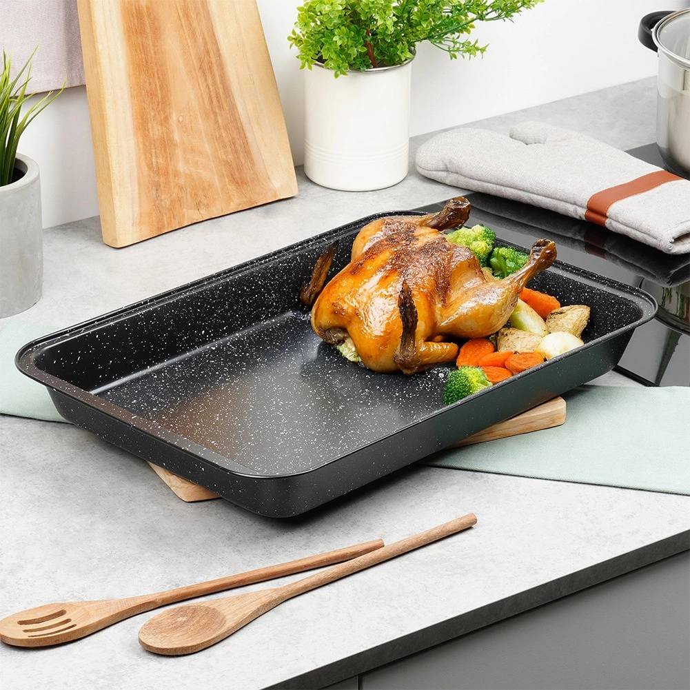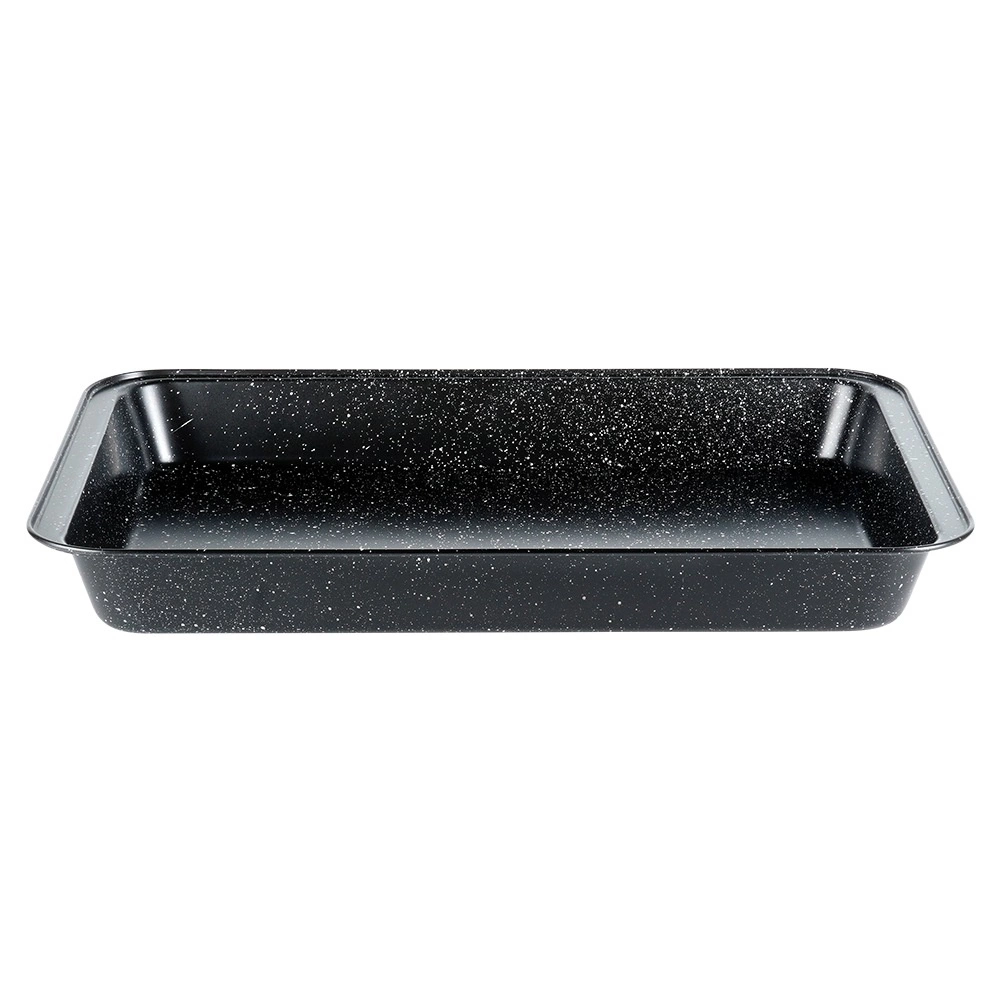 Robusni pravokutni lim s granitnom površinom pobrinut će se za pouzdan rezultat pečenja bez zagorijevanja. Ne upija mirise ni tekućine, a zahvaljujući kvalitetnom ugljičnom čeliku izvrsno provodi toplinu, pa su jela ravnomjerno pečena po cijeloj površini.