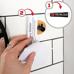 Ugradnja je brza i čista: kuku pričvrstite pomoću priloženog ljepila i pomoćnih samoljepljivih naljepnica. Za najbolji rezultat prije ugradnje temeljito očistite i odmašćite površinu i ostavite ljepilo da se stvrdne oko 72 sata prije prvog opterećenja.