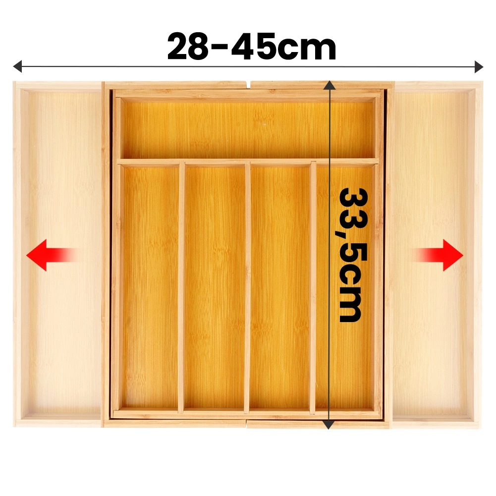 Organizirajte svoju kuhinju brzo i učinkovito. Bambusov uložak-organizator za ladicu s mogućnošću proširenja s 35,5 na 54,5 cm prilagođava se većini standardnih ladica i nudi dovoljno prostora za pribor za jelo, noževe i kuhinjski alat. U zatvorenom stanju dimenzije su 45,5 × 35,5 × 5 cm, a nakon proširenja 54,5 × 45,5 × 5 cm.