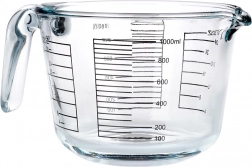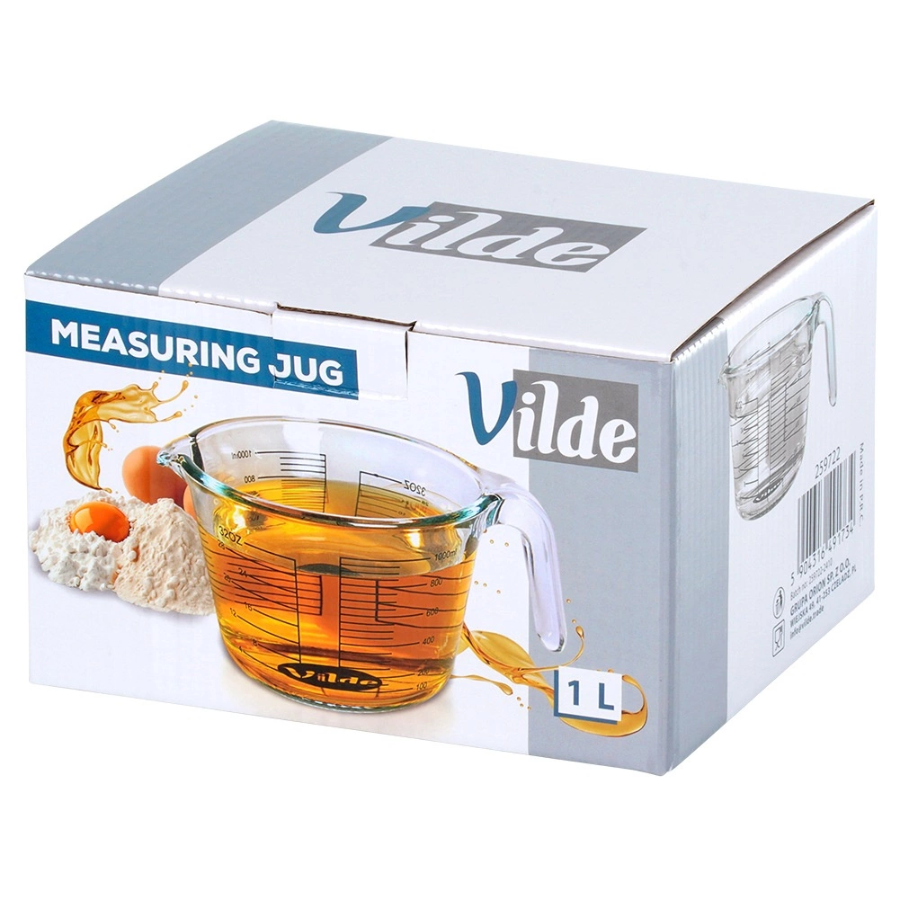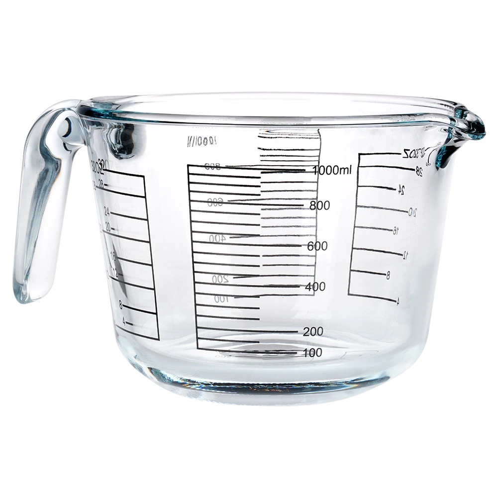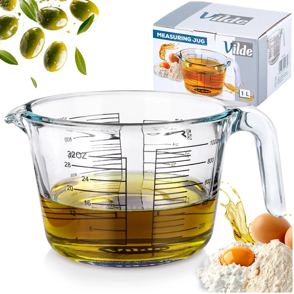 Ova staklena mjerna čaša u obliku vrča nezamjenjiv je pomagač u svakoj kuhinji. Pregledna crna ljestvica omogućuje precizno mjerenje u mililitrima (100–1000 ml) i tekućim uncama (4–32 oz). Ergonomska drška i oblikovani izljev osiguravaju sigurno i čisto točenje bez kapanja.