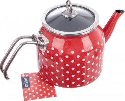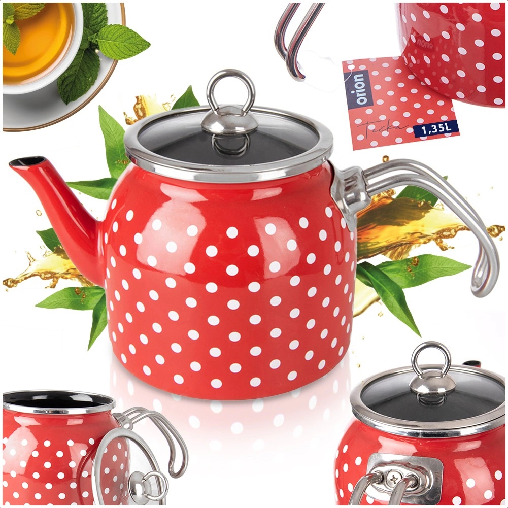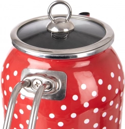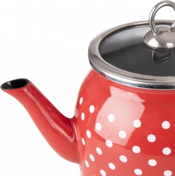 Emajlirani čajnik TOČKA spaja retro izgled s modernom funkcionalnošću. Crveni emajl s bijelim točkicama nadopunjuju inox rub i ručka, a unutrašnjost je u elegantnoj crnoj boji. Stakleni poklopac omogućuje praktično praćenje vrenja, a zahvaljujući prihvatu lako se podiže pri dolijevanju vode.