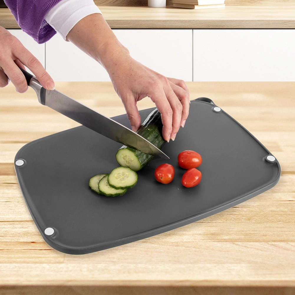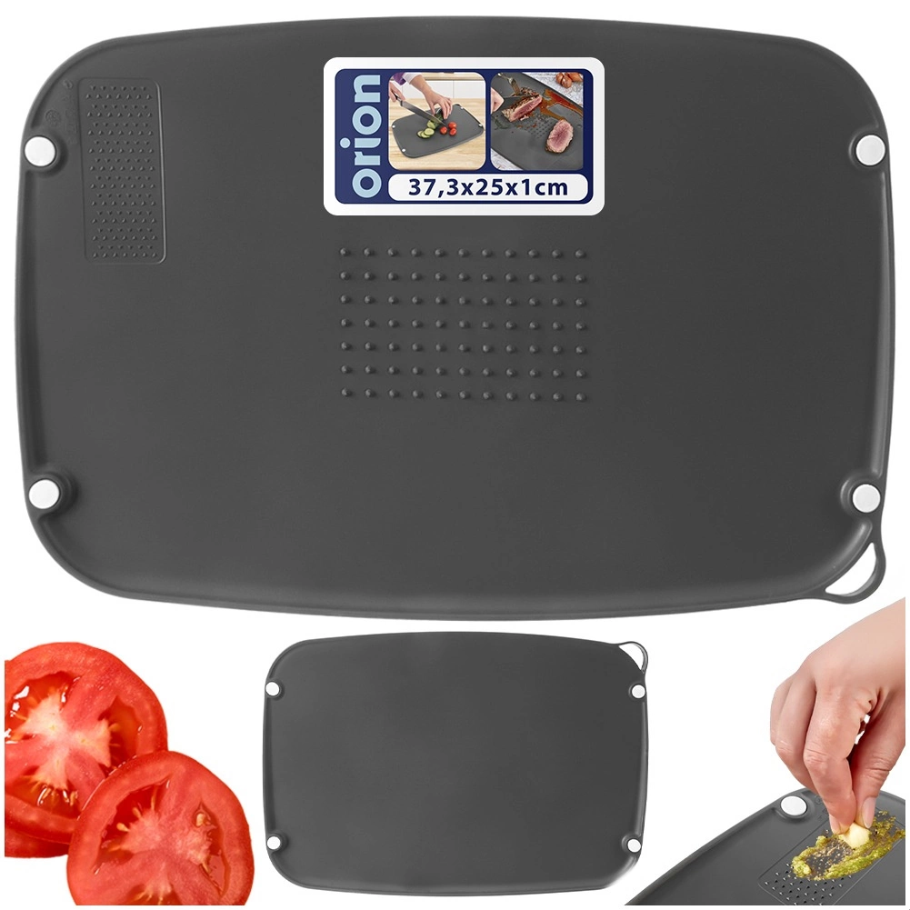 Daska je izrađena od izdržljive, za hranu sigurne plastike u elegantnoj sivoj boji. Lako se održava – može u perilicu posuđa i podnosi temperature do +95 °C. Praktičan otvor olakšava vješanje i štedljivo odlaganje.