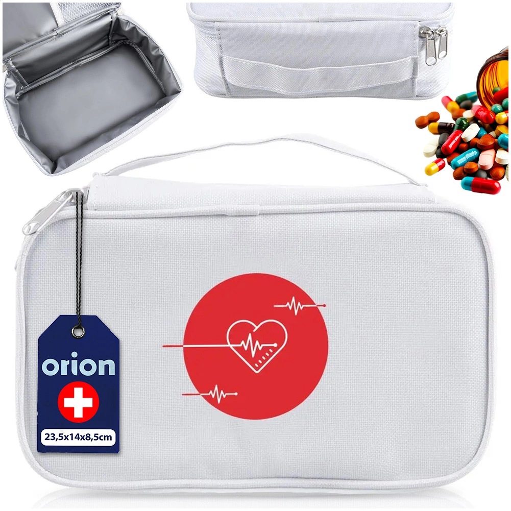 Čuvajte lijekove, sirupe, injekcije i male medicinske pribore sigurno i pregledno. Termo torba ORION izrađena je od čvrstog poliestera u bijeloj boji s crvenim motivom srca i EKG-a. Termoizolacijska podstava pomaže održati stabilnu temperaturu i štiti sadržaj pri kratkotrajnom prijenosu.