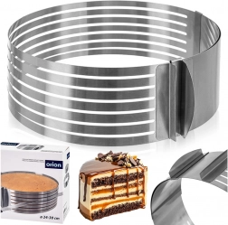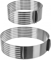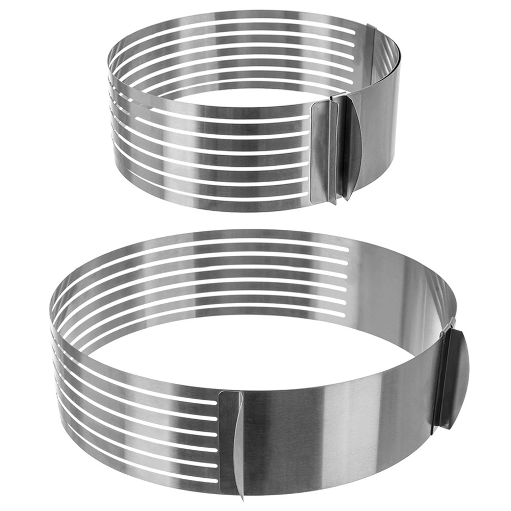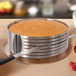 Inox prsten za rezanje biskvita idealan je pomagač za ljubitelje pečenja koji žele postići savršeno ravne slojeve bez kompliciranog mjerenja. Podesiva kopča omogućuje precizno prilagođavanje promjera od 24 do 30 cm, a vodilice pomažu voditi nož u jednoj ravnini.