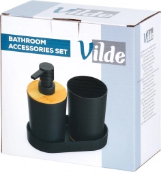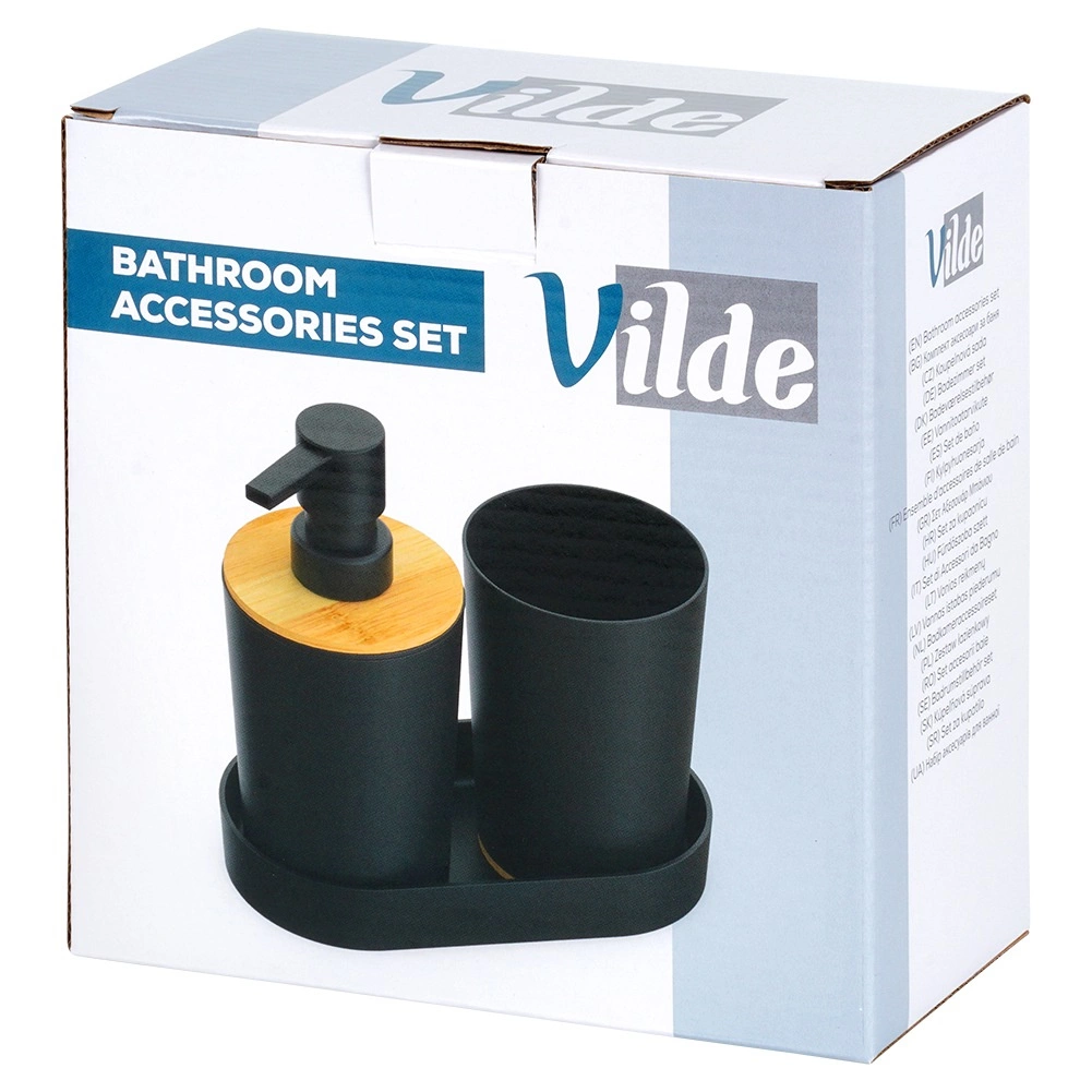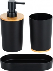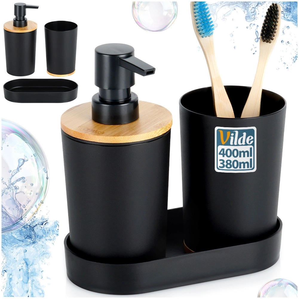 Ovaj praktičan set idealan je za svakodnevnu uporabu uz umivaonik. Dozator za tekući sapun s glatkim pumpnim upravljanjem, prostrana čaša za četkice ili pastu i stabilna podloga stvaraju cjelovit i uredan sklop. Mat crna u kombinaciji s prirodnim bambusom djeluje stilski u modernim i klasičnim interijerima.