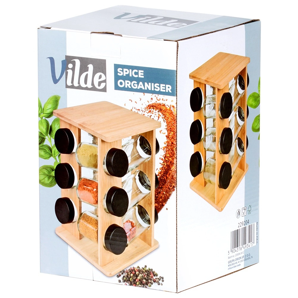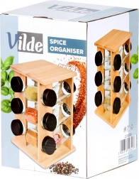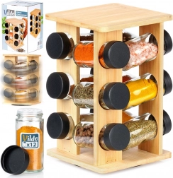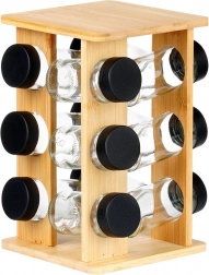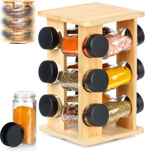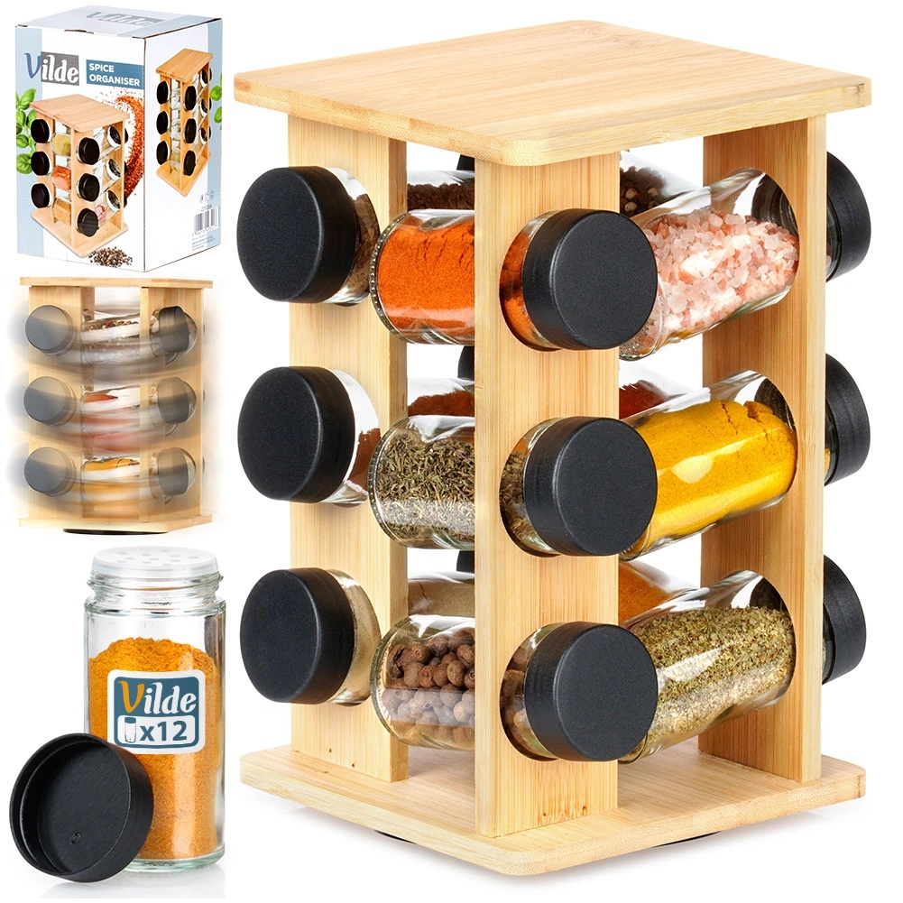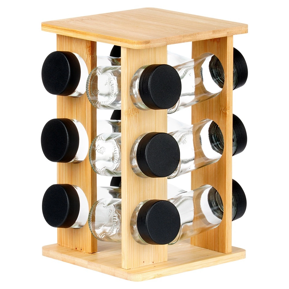Držite začine nadohvat ruke i u savršenom redu. Okretni stalak od prirodnog bambusova drva prima 12 staklenih posudica s crnim navojnim poklopcima i bijelim sitima za praktično doziranje. Zahvaljujući okretnom mehanizmu lako ćete pronaći željeni sastojak, dok kompaktna vertikalna konstrukcija štedi prostor na radnoj plohi i u ormariću.