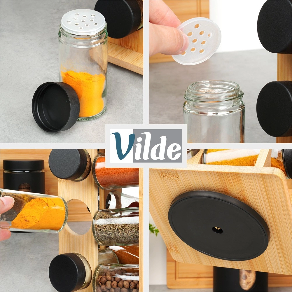 Stalak od bambusova drva je stabilan i elegantan. Prozirne staklene posudice s crnim poklopcima izdržljive su i bez poklopaca prikladne za perilicu posuđa.
