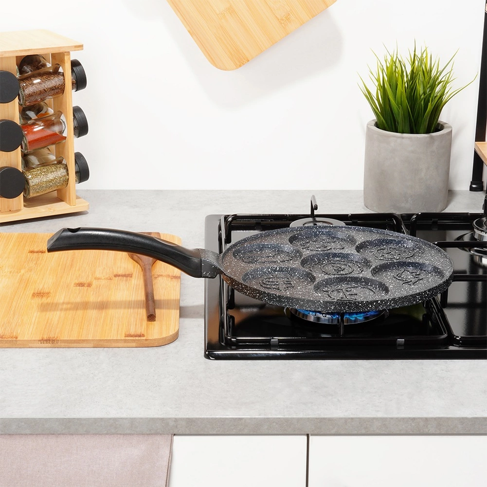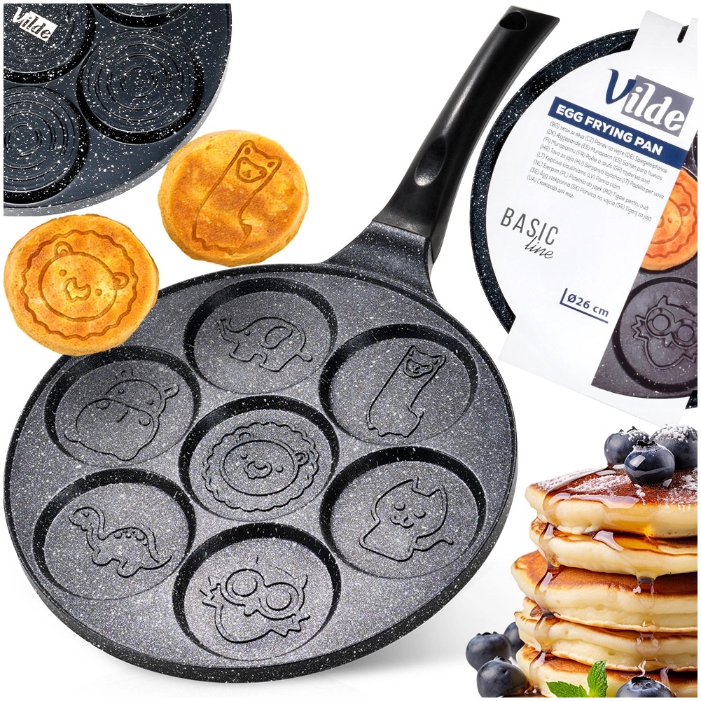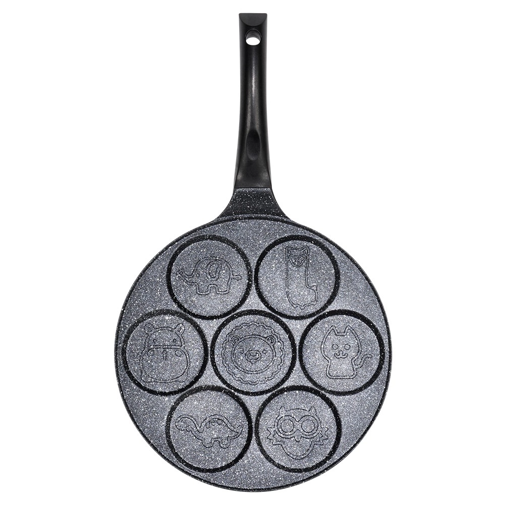 Ova stilska tava sa sedam kalupa idealna je za pripremu jaja, palačinki i mini pancakesa s veselim reljefima životinjica. Neprianjajući granitni premaz omogućuje lako odvajanje namirnica i jednostavno čišćenje, dok aluminijsko tijelo pruža brzu i ravnomjernu raspodjelu topline.