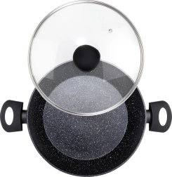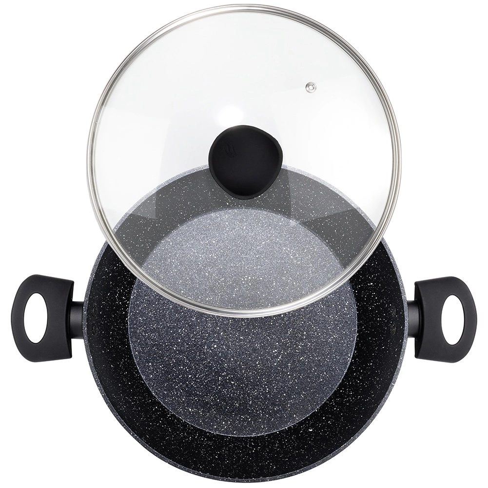 Duboka tava BLACK LINE spaja moderan dizajn i svakodnevnu praktičnost. Robusno aluminijsko tijelo s granitnim neprianjajućim slojem olakšava pripremu zdravih jela i minimalizira zagorijevanje. Prozirni stakleni poklopac s parnim ventilom omogućuje nadzor nad zbivanjima u tavi i zadržava sočnost jela.