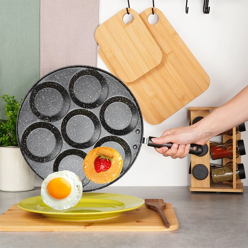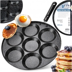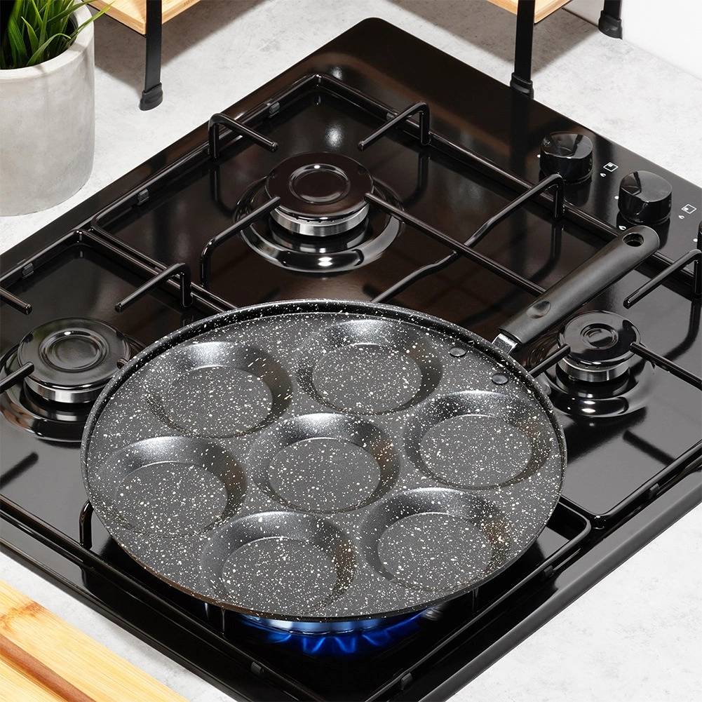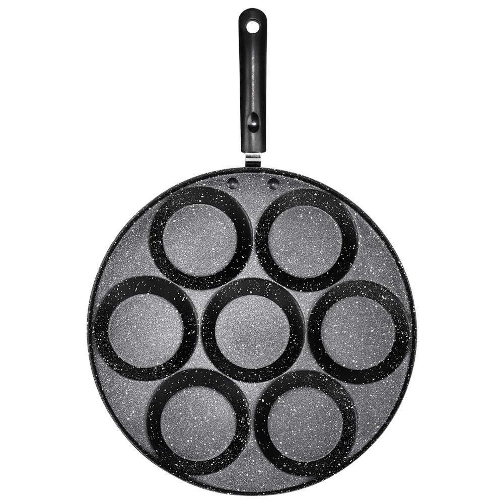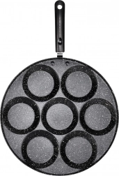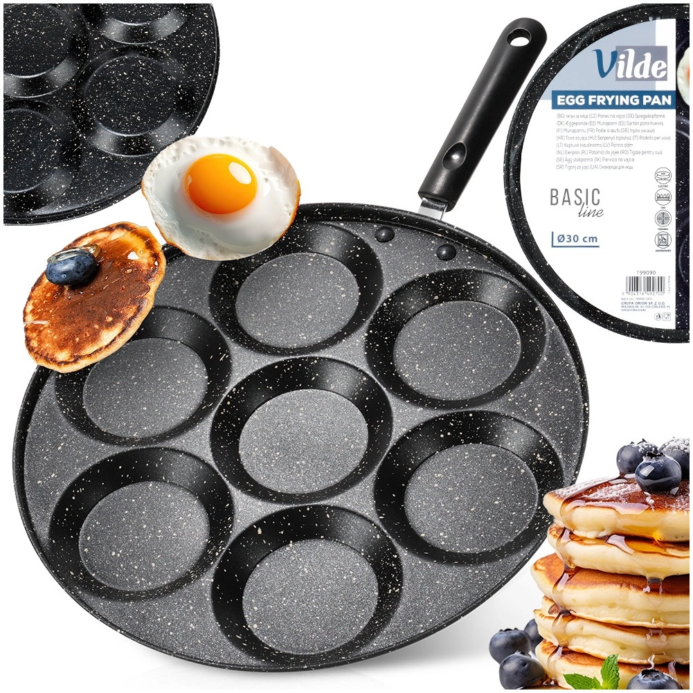 Otkrijte svestranu tavu za brzu i udobnu pripremu doručka. Sedam zasebnih kalupa promjera 9 cm stvara ujednačene i jednolike porcije, idealne za jaja, male popečke i poffertjes. Kvalitetna neljepljiva granitna obrada minimalizira prijanjanje i omogućuje kuhanje s manjom količinom ulja.