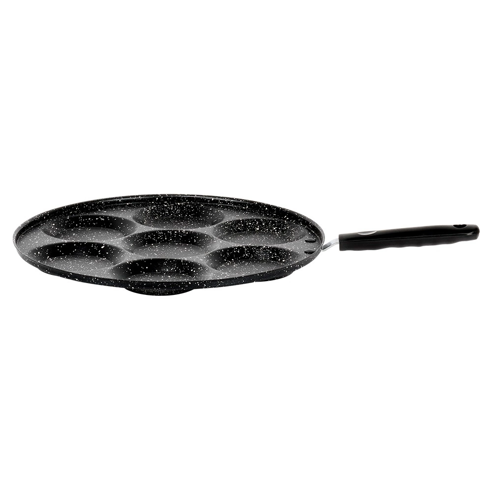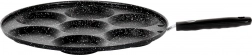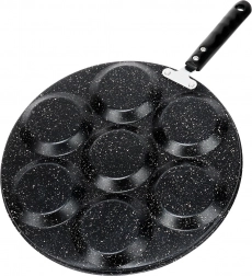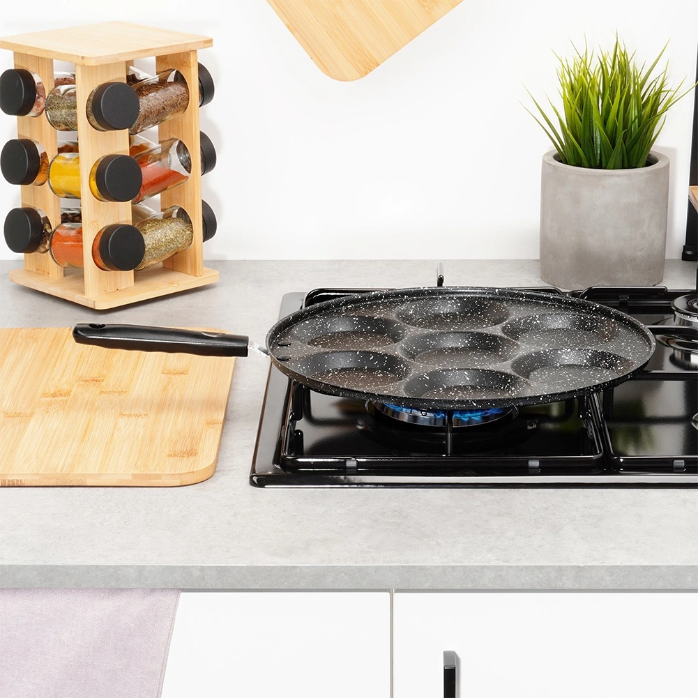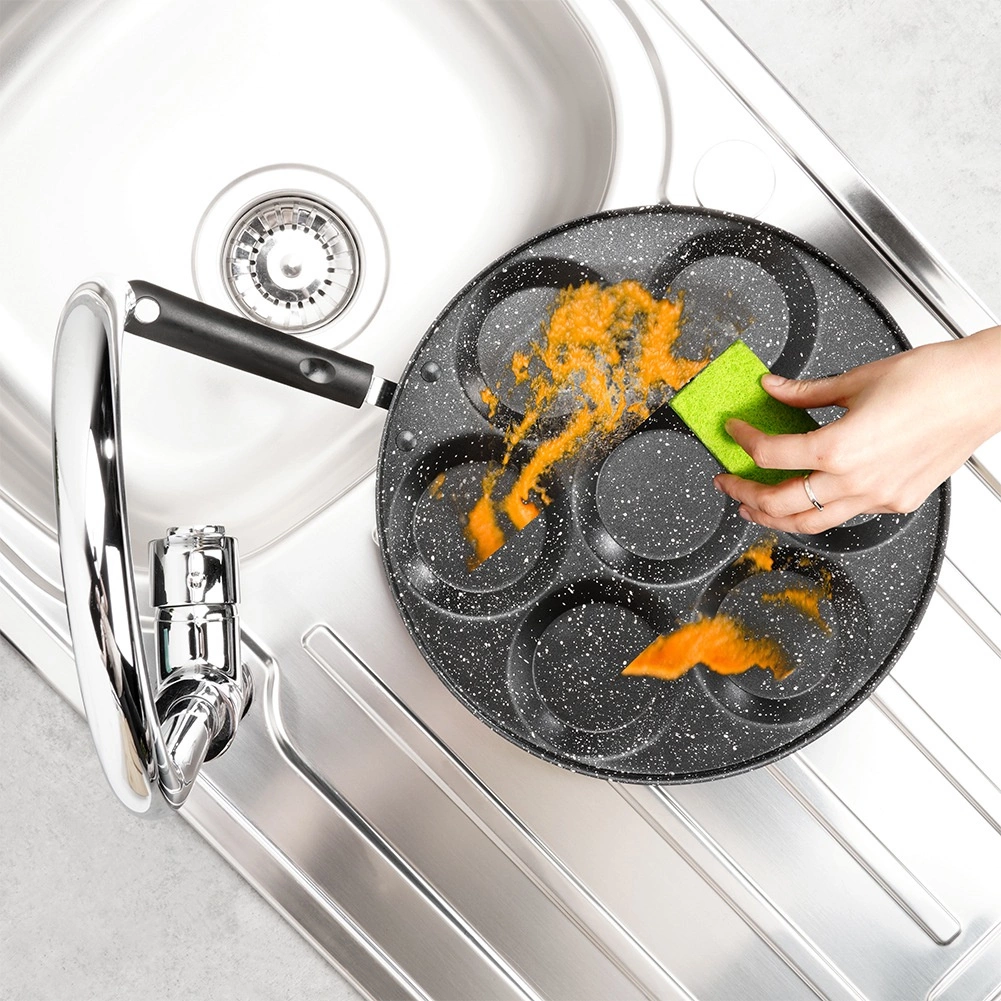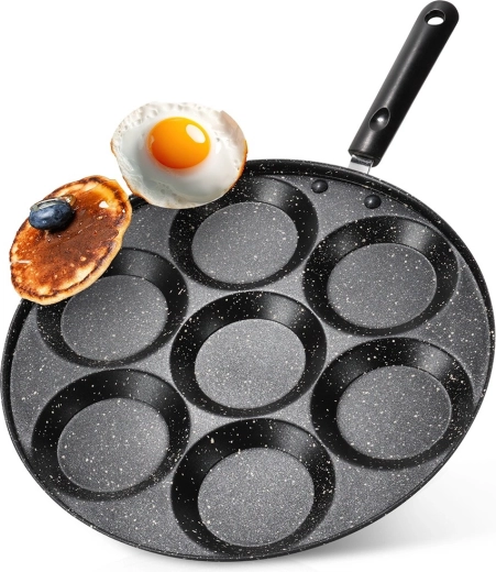 Otkrijte svestranu tavu za brzu i udobnu pripremu doručka. Sedam zasebnih kalupa promjera 9 cm stvara ujednačene i jednolike porcije, idealne za jaja, male popečke i poffertjes. Kvalitetna neljepljiva granitna obrada minimalizira prijanjanje i omogućuje kuhanje s manjom količinom ulja.