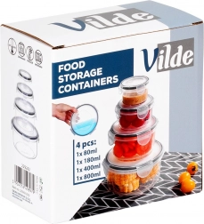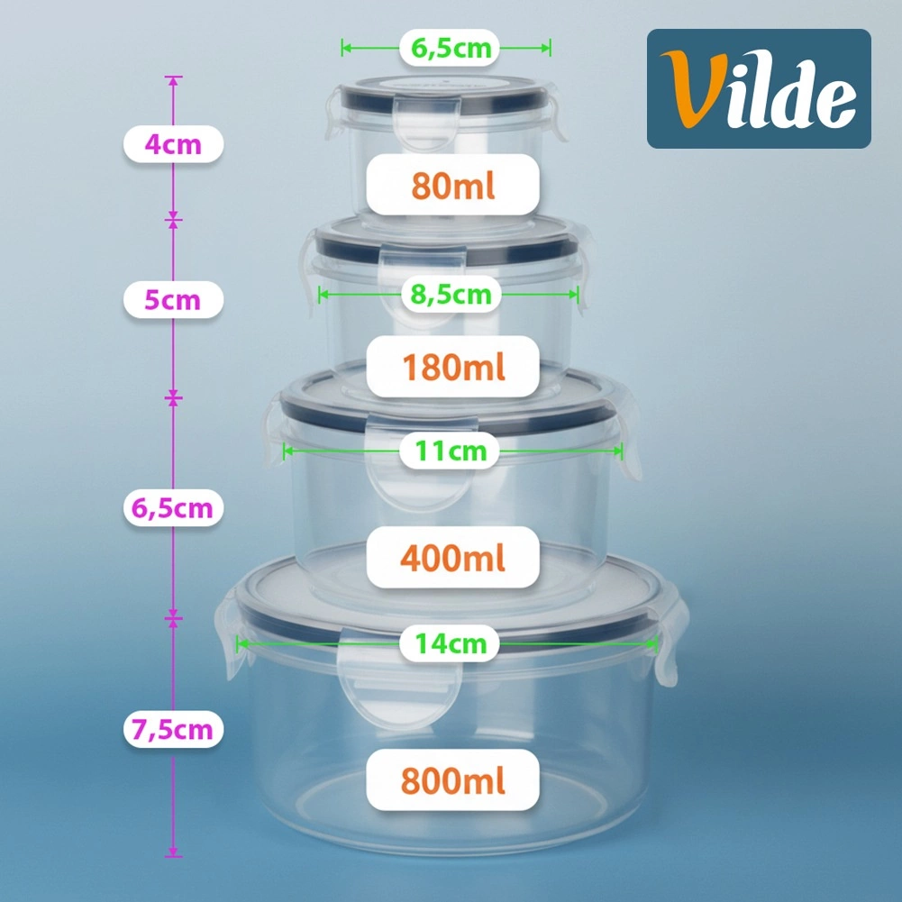 Četiri okrugle posude (800/400/180/80 ml) slažu se jedna u drugu i štede prostor u ladicama i smočnici.