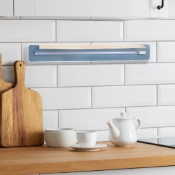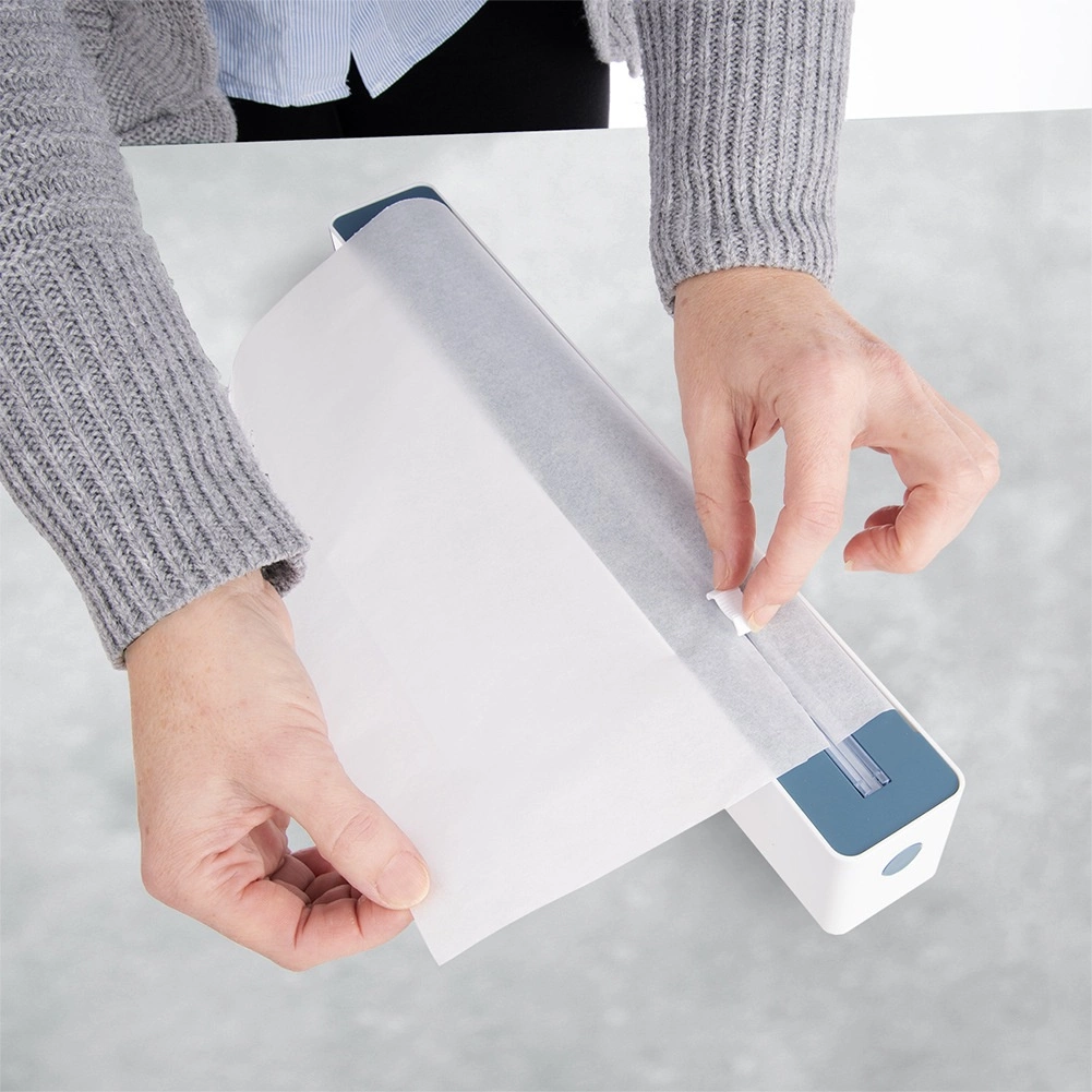 Održavajte kuhinju savršeno urednom s elegantnim dozatorom koji spaja brzo odmjeravanje, čist rez bez resica i praktično odlaganje rola. Integrirana letvica s oštrim rubom reže glatko i ravno, dok unutarnji graničnici sprječavaju klizanje role.