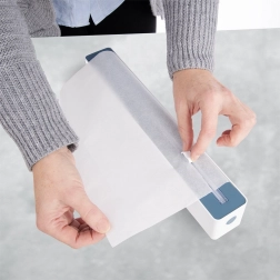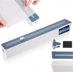 Dozator je prikladan za plastičnu foliju za hranu, aluminijsku foliju i papir za pečenje. Zahvaljujući priloženim vakuumskim čepovima i dvostranoj 3M traci možete ga pričvrstiti na glatke površine bez bušenja ili ga jednostavno pospremiti u ladicu. Zamjena role traje sekunde – pritisnete bočne kopče, postavite rolu na nosače i spremni ste za rezanje.