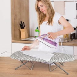 Tražite kompaktno rješenje za malu ili stolnu dasku za glačanje? Ova siva navlaka s bijelim geometrijskim uzorkom izrađena je od čistog pamuka, a s donje strane ima mekanu filcanu ispunu debljine 5 mm za bolje klizanje glačala i zaštitu ploče. Standardna dimenzija 77 × 31 cm pristaje većini manjih dasaka.
