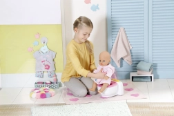 BABY born već ide na WC! Čim sjedne na svoj bijeli tron s ružičastim sjedištem, čut ćeš zvukove piškjenja, pljeska i veselog smijeha. BABY born se zna i pokakati. U tom slučaju u školjci se pojavi šareno, svjetlucavo kaka. Brzo, vrijeme je za ispiranje! Kada pritisneš gumb za ispiranje, kaka nestane i čuju se zvukovi ispiranja.