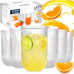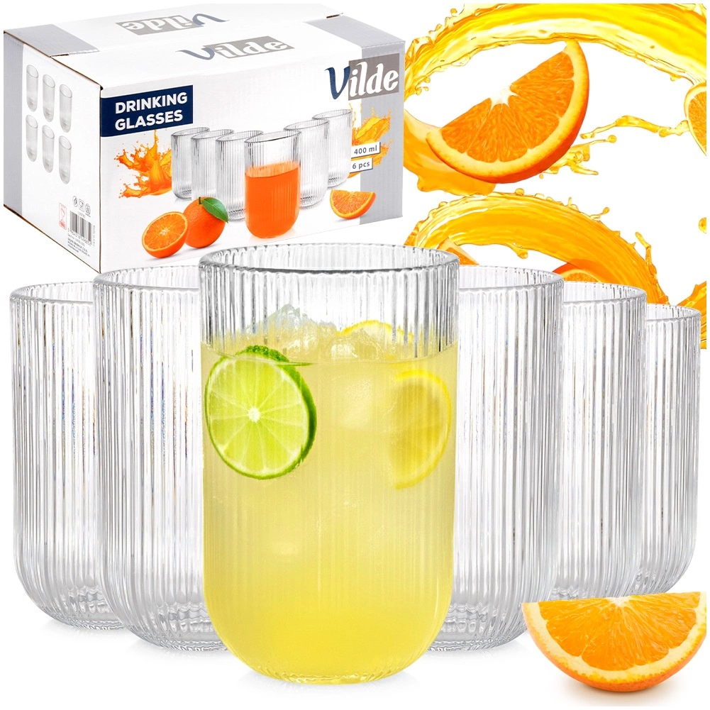 Otkrijte univerzalne čaše s vertikalnim rebrima koje osiguravaju siguran prihvat i moderan izgled. Svaka čaša ima volumen 400 ml, pa je savršena za vodu, limunadu, ledeni čaj, sok i miješane napitke. Prozirno staklo lijepo ističe boju napitka i ukrase od citrusa ili bilja.